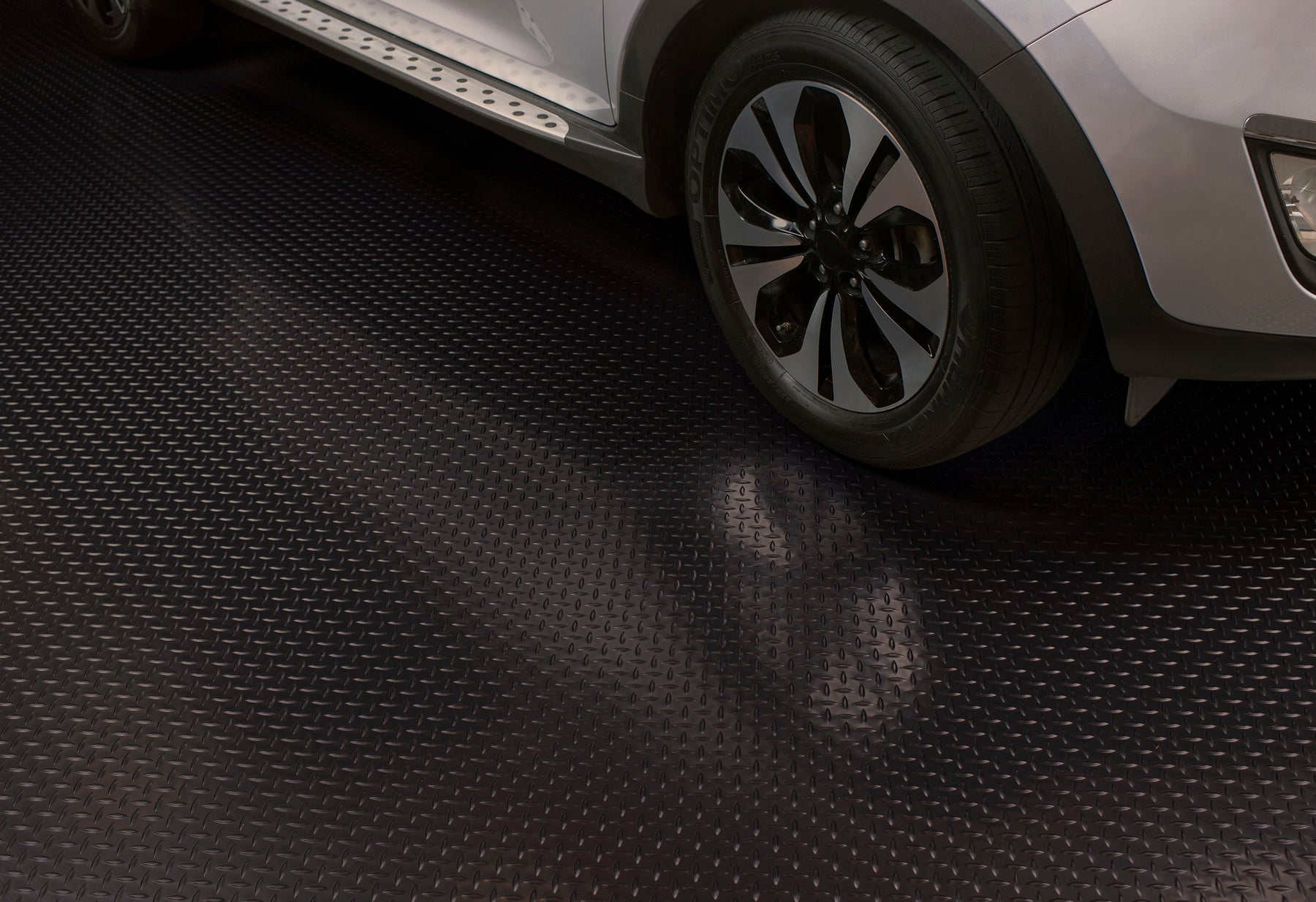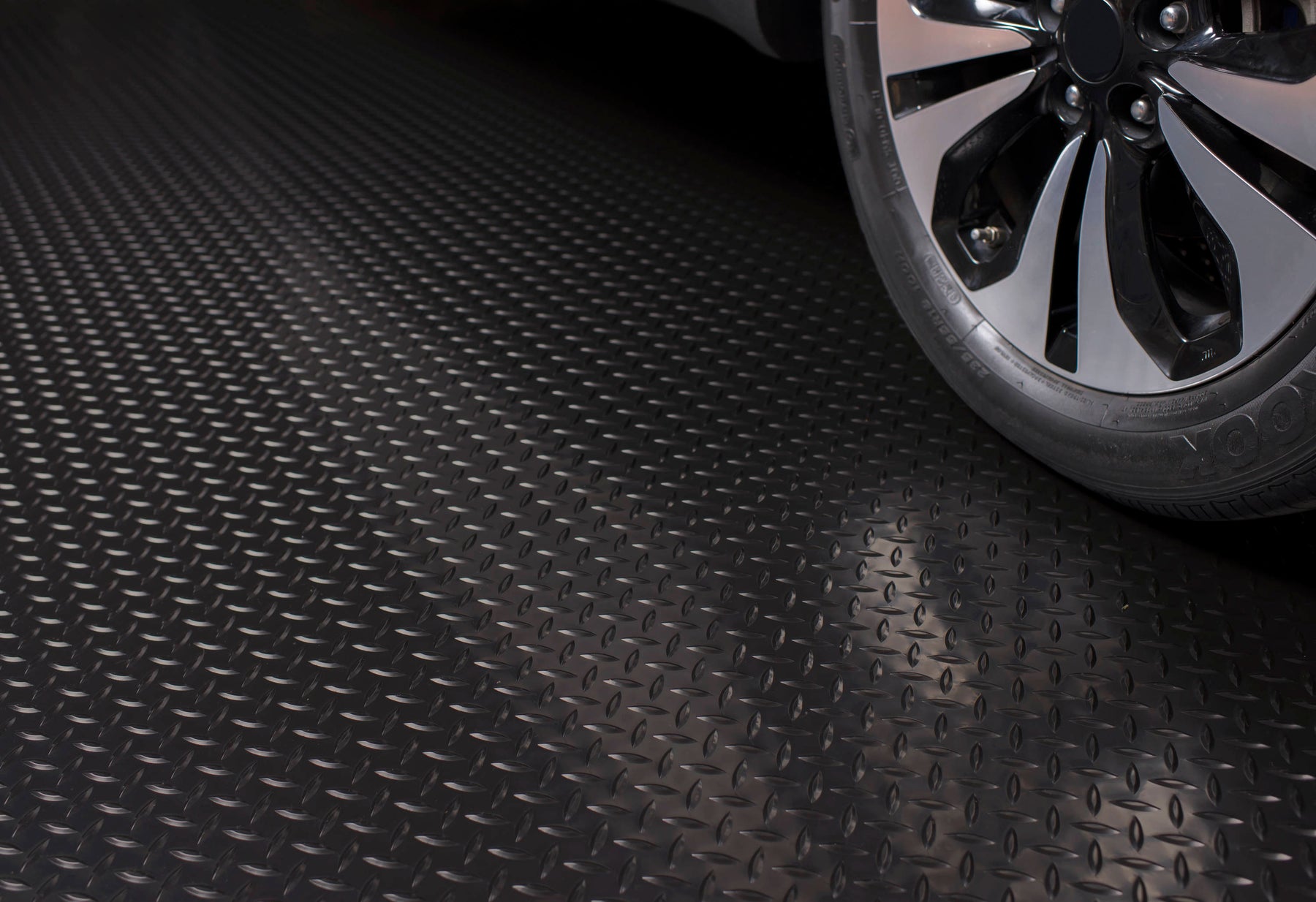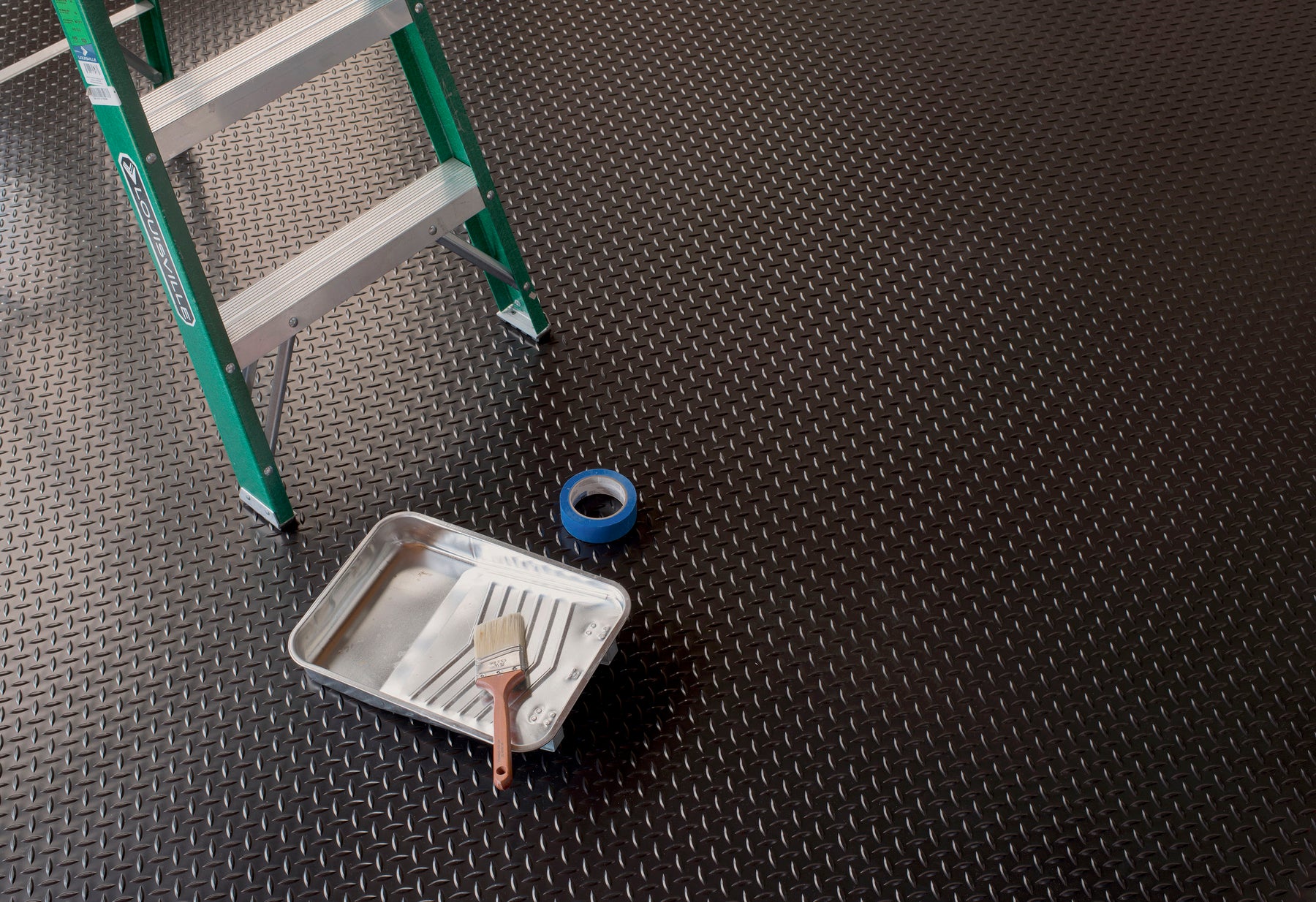Heavy-duty G-Floor Diamond Tread roll-out flooring protects and upgrades garages and workspaces. Made from 100% solid polyvinyl, this 75‑mil thick mat resists chemicals, water, stains and wear while adding rugged traction with its diamond-plate texture.