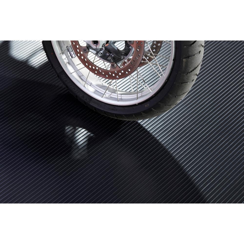 Durable 100% polyvinyl garage floor roll with ribbed channels to trap moisture and debris. Sized 5 ft x 10 ft, it protects concrete from stains, hides cracks, and installs easily with loose lay or adhesive. Waterproof, salt-resistant, and ideal for residential or commercial spaces.