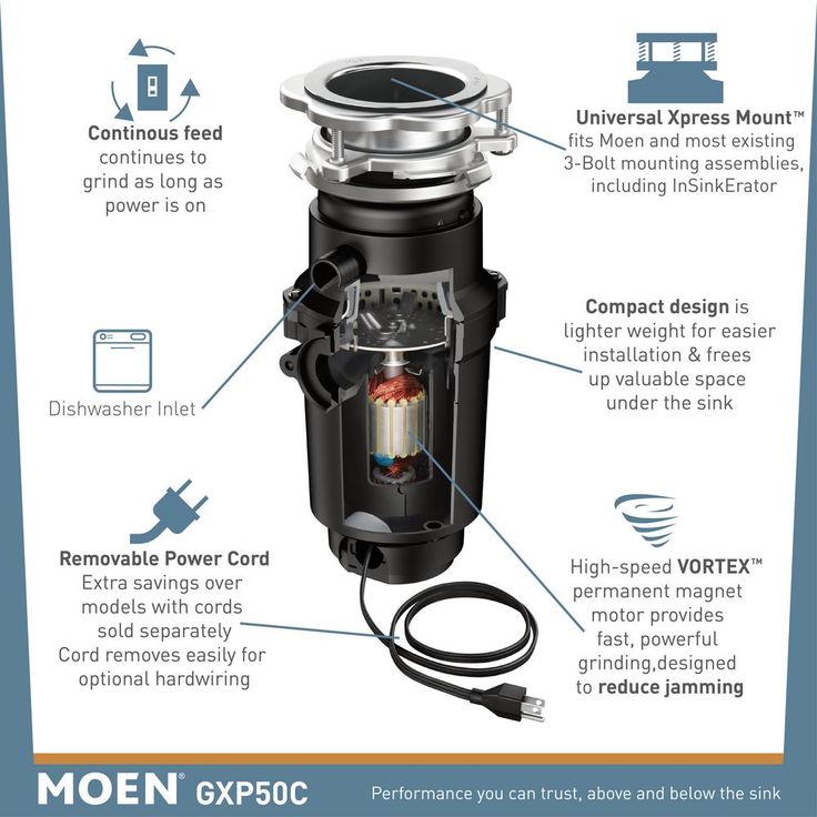 • Includes GXP50c disposal unit with universal xpress mount, pre-installed power cord, removable splash guard, drain stopper, sink flange, drain elbow and mounting assembly