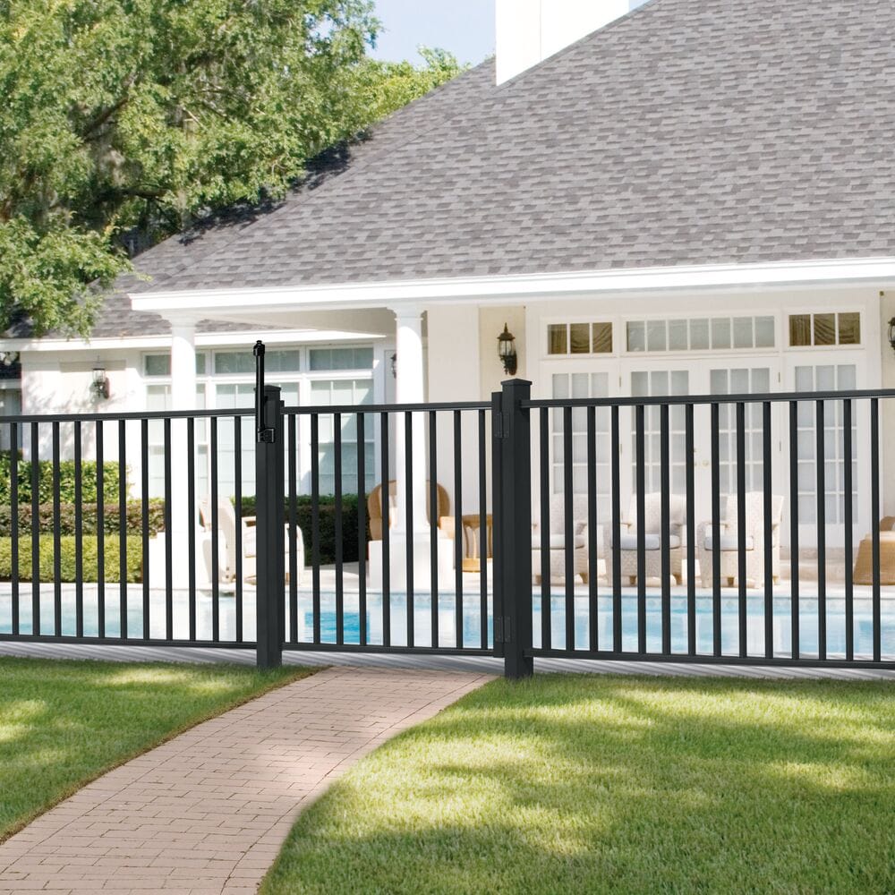 The Easton 4-ft H x 4-ft W Black Aluminum Fence Gate offers both style and durability with its sleek, powder-coated finish. Designed to complement the Freedom 4x6 Easton fence panel, this gate provides a lifetime of rust-free, fade-resistant performance with no visible fasteners for a seamless look.