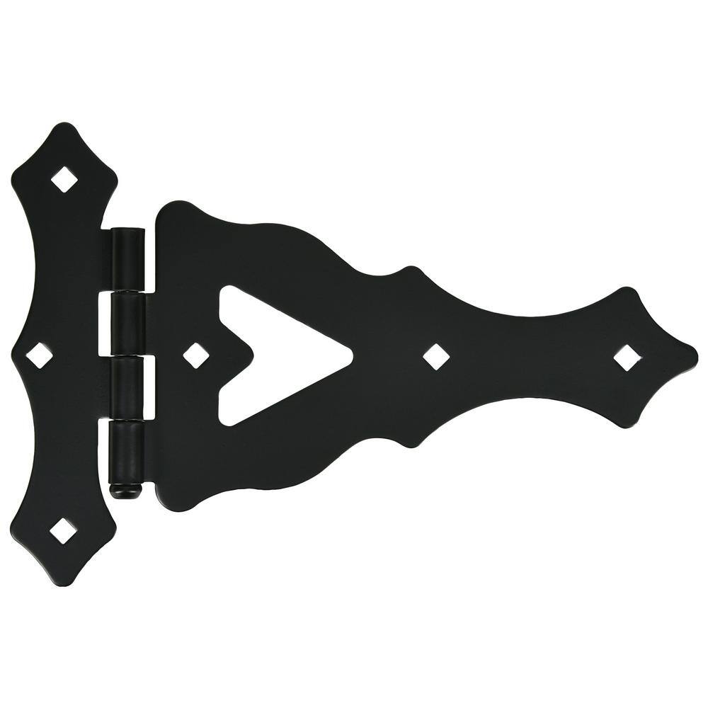 Upgrade the strength and style of your gates and shed doors with the Hardware Essentials 10 in. Black Heavy Duty Ornamental T-Hinge 4-Pack. Built from robust steel, these hinges deliver dependable performance while featuring a decorative black finish that enhances the look of any exterior door. Ideal for sheds, gates, and storage boxes, each hinge is designed for ease of installation and versatility.