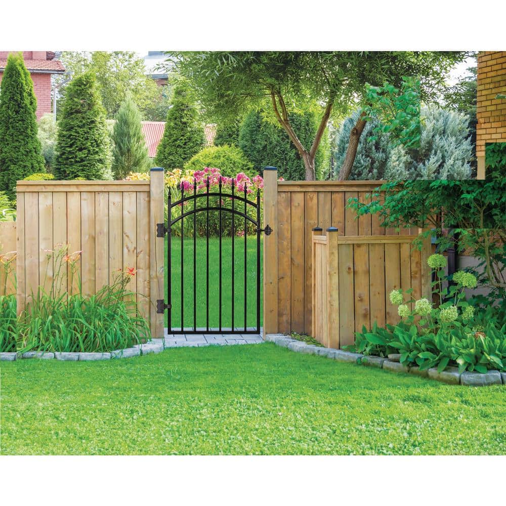 Elevate your outdoor space with the NUVO IRON Black Iron Arched Fence Gate, featuring a striking Tiger Eye profile and elegant spear-top pickets. Crafted from heavy-gauge galvanized steel and finished in a textured black powder coat, this gate combines aesthetic charm with rust-resistant durability. Ideal for both contractors and DIY enthusiasts, it offers easy installation with pre-assembled hardware and self-closing hinges.