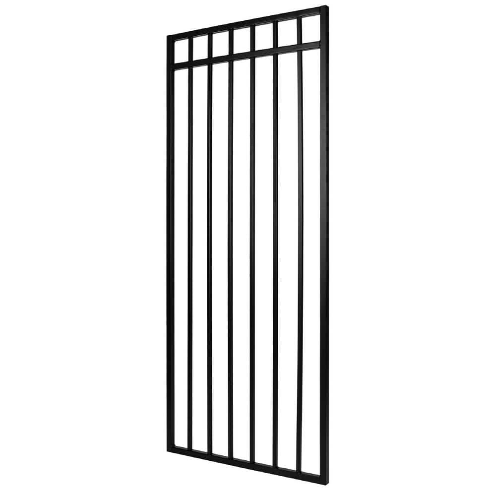 Bring a touch of sophistication to your garden or driveway with the Coral Profile Fence Gate. Its sleek black lines and flat top design create a striking entrance, effortlessly blending modern aesthetics with timeless charm. Pair it with lush greenery or minimalist stone pathways for a captivating exterior statement. Let this gate be the keystone in framing your luxurious outdoor haven, merging functionality with sleek design.