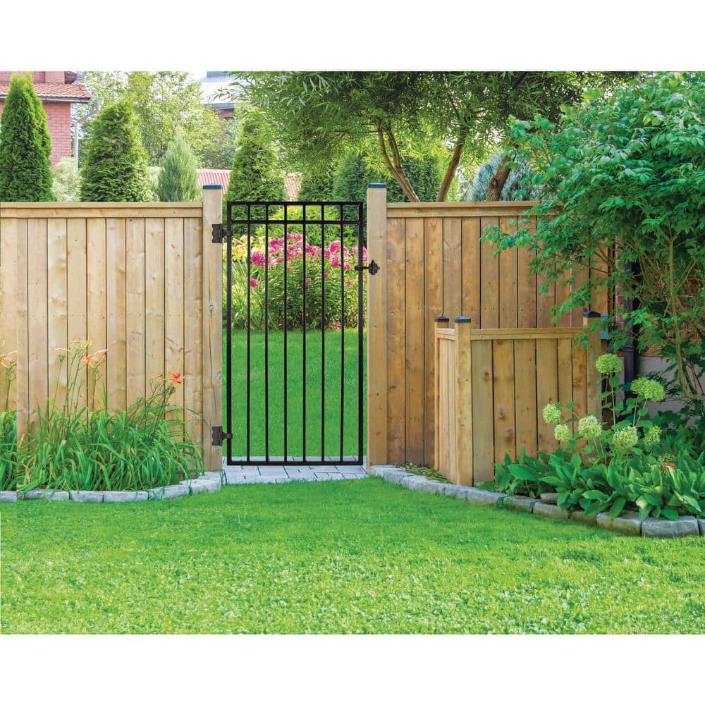 Elevate your outdoor space with the NUVO IRON Coral Profile Fence Gate, crafted from durable galvanized steel. Its sleek design features a textured black powder-coated finish and self-closing hardware for added convenience and safety.