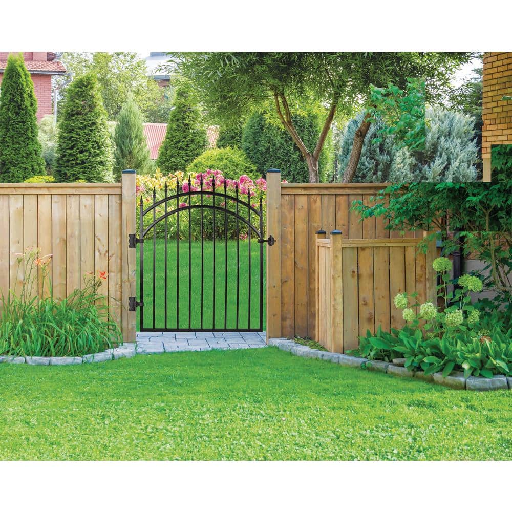The NUVO IRON Black Metal Arched Fence Gate perfectly blends aesthetic appeal with durability. Its tiger eye profile and spear-top pickets embody classic elegance, while galvanized steel construction ensures longevity and strength. Pre-assembled with all essential hardware, it's designed for convenience and seamless installation.