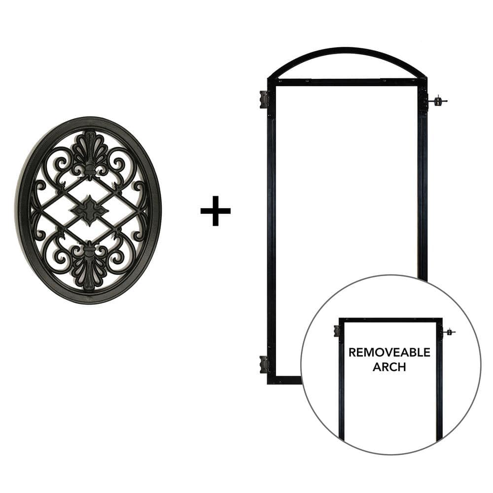 Enhance your fencing project with the NUVO IRON EZ Install Arched Pro Gate Frame, featuring a 13 in. x 17 in. oval gate insert. Built from durable galvanized steel with a sleek black powder-coated finish, this gate frame is perfect for creating a robust yet elegant entry to your outdoor space. The cast aluminum insert adds a stunning wrought iron look, ensuring your gate stands out.