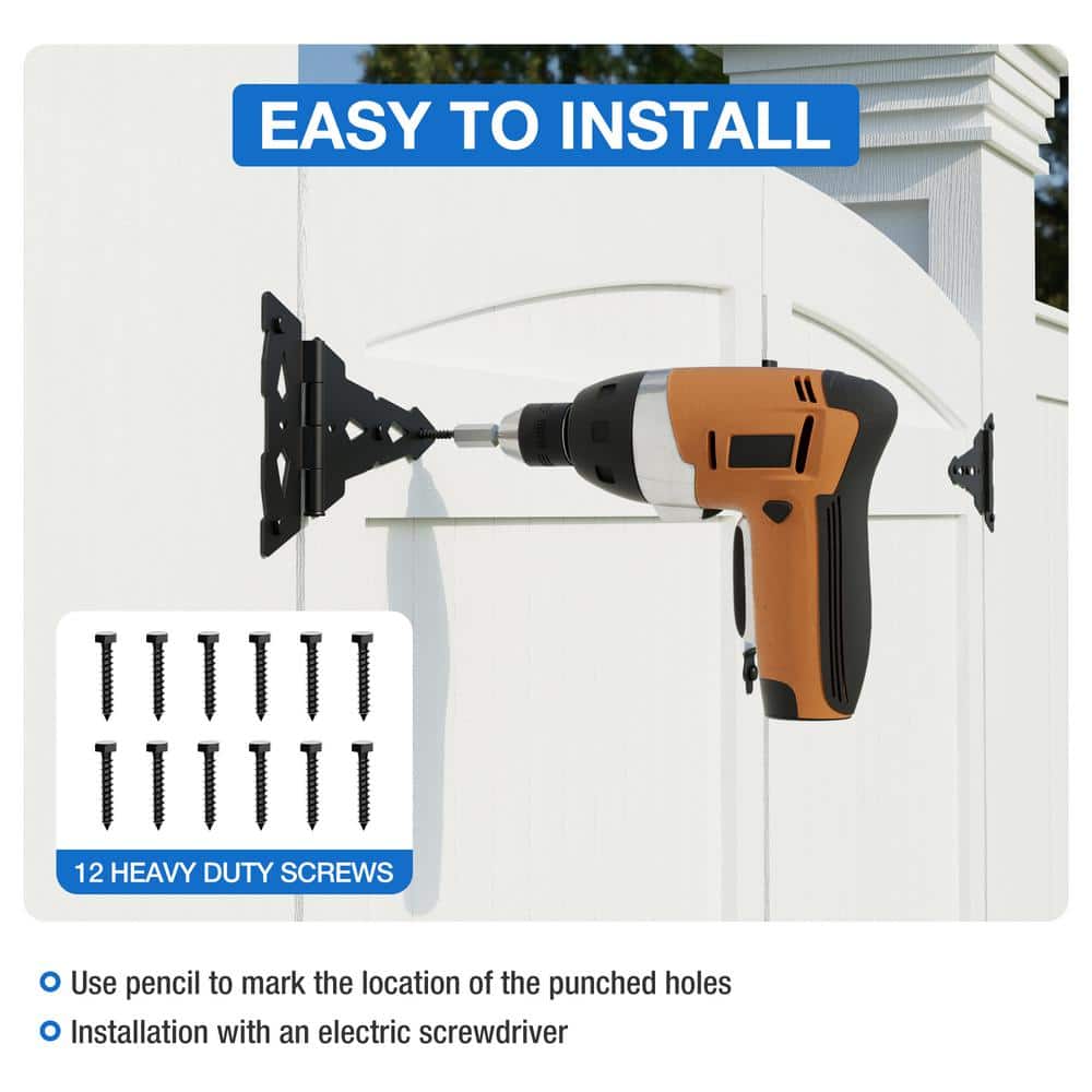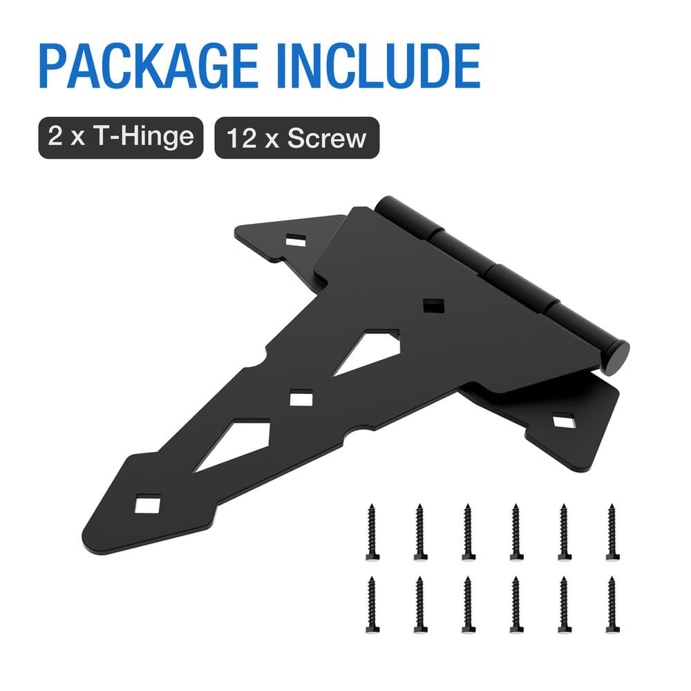 A: The package includes two heavy-duty decorative tee hinges along with twelve screws for installation.