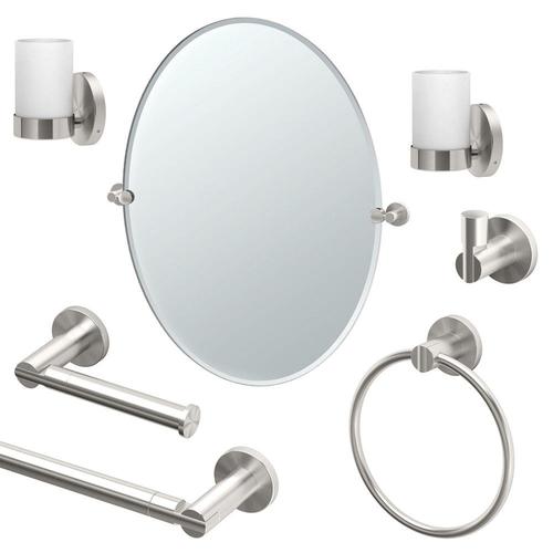 Kit includes mirror, wall sconces, 24-in towel bar, towel ring, toilet paper holder, robe hook Pivot mirror tilts to your desired viewing angle Lights accommodate a 100W (medium base) bulb, which illuminates the appearance of any room with a hint of charm Easy installation; includes necessary mounting hardware Satin nickel finish Switching out bathroom accessories is a simple update that can completely transform your bathroom Lifetime functional guarantee on all Gatco products; 5-year warranty on finish