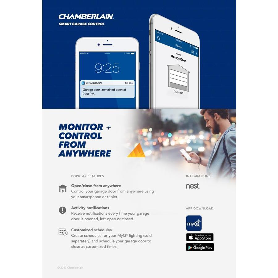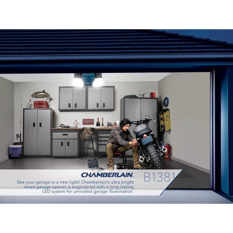 Corner to corner lighting™: features precision engineered LED system with 3,100 lm that fill the entire garage Built-In Wi-Fi® and MyQ® connectivity: open and close your garage door from wherever, whenever, with MyQ app connectivity Battery backup: keep your garage door accessible even when the power is out Belt drive: the Chamberlain B1381 opens and closes smoothly and quietly thanks to its DC belt drive opener, eliminating vibrations throughout your home Max lift power system™: durable DC belt drive and max lift power system combine to lift the equivalent of 1-1/14 HP and provides the highest lifting capacity in the category for superior performance in extreme conditions Box includes: Battery Backup, wireless keypad, full function wall control, two-3 button remotes, safety sensors About chamberlain: the largest and most dependable garage door opener manufacturer in north America