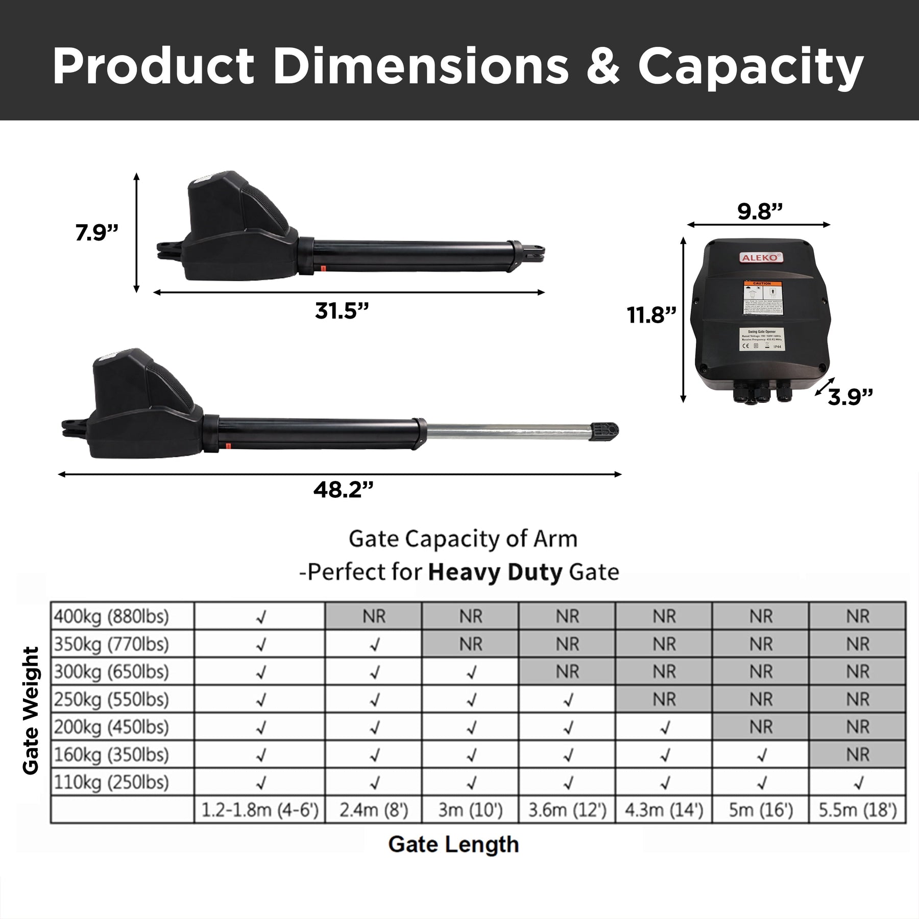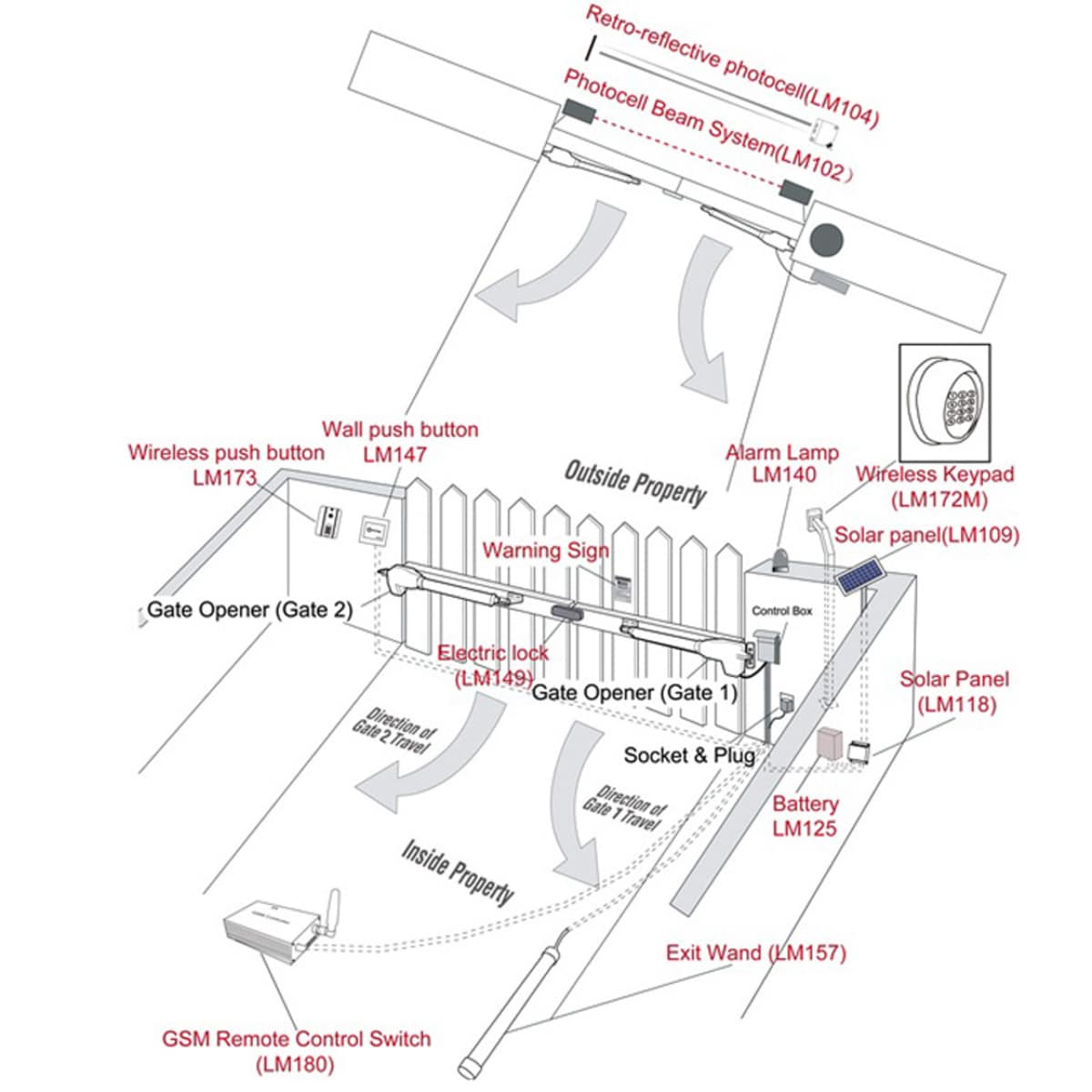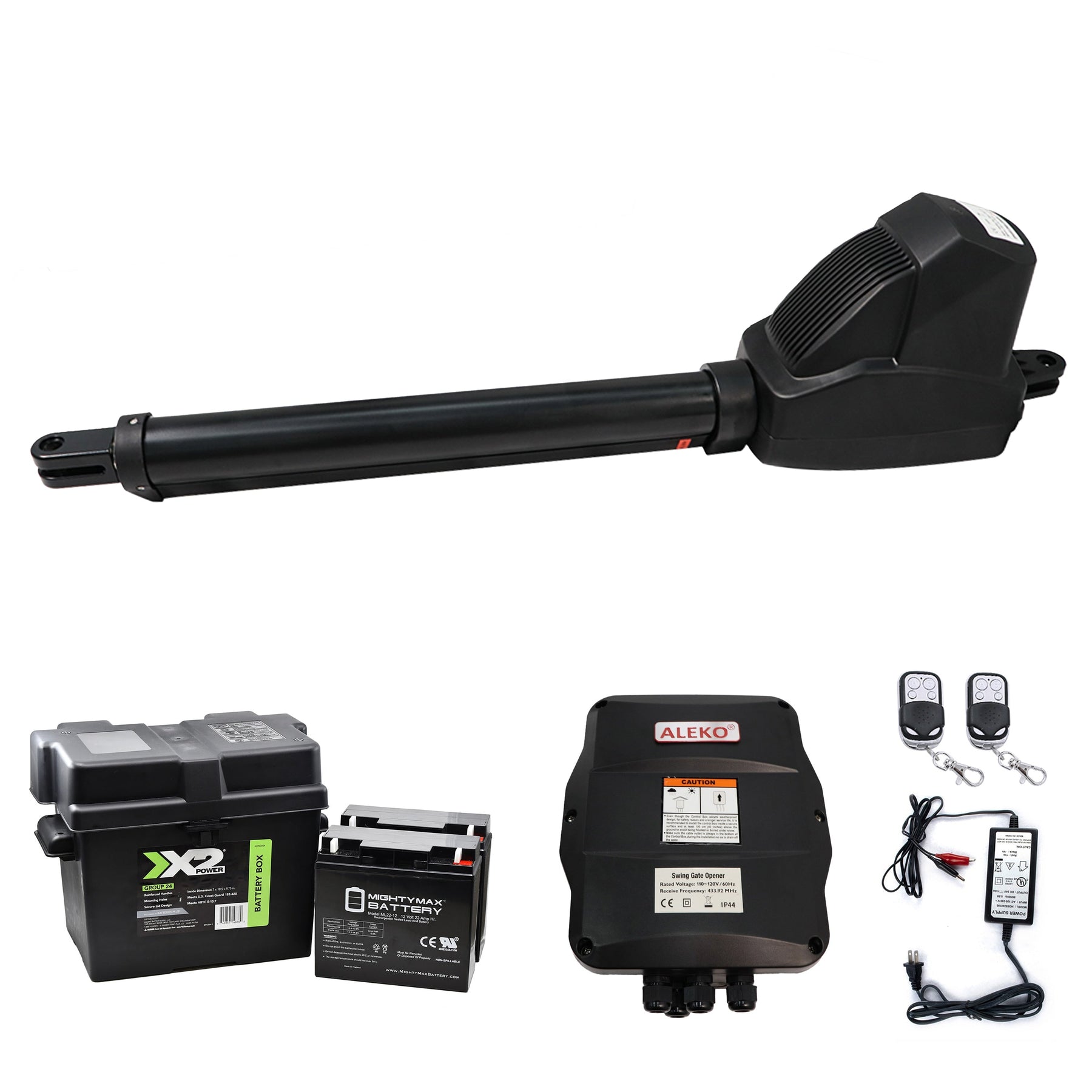 | Package Contents | 1 Actuator, 1 Control Box, 2 x 8.5 x 11" Warning Signs, 2 Release key, 2x433MHz remotes LM122, 1 LM135 24V Adapter/Battery Charger, 1 Set 2x12AH Batteries LM125(2x12AH), 1 LM130 Battery Box for 2x12AH Batteries, 1 Set of accessories and mounting hardware |