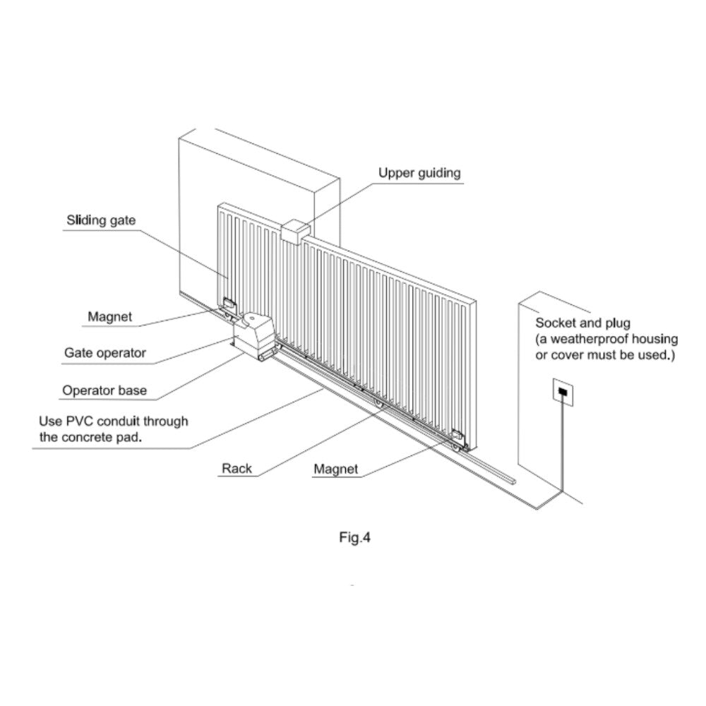 | Package Contents | 1 (One) sliding gate opener unit, 1 (one) set of ALEKO 13Ft nylon gear racks reinforced with a metal insert 3.3 Ft each-4pcs, 1 (one) mounting metal base, 2 (two) 433MHz remotes LM122, 1 (one) set of accessories and mounting hardware, 1 (one) user manual |