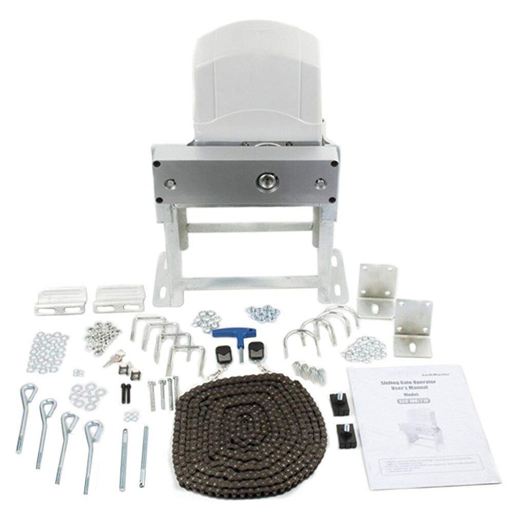 A: The package includes a sliding gate opener unit, 20 ft chain, mounting base, remotes, keypad, push button, photocells, and all necessary accessories and hardware for installation.