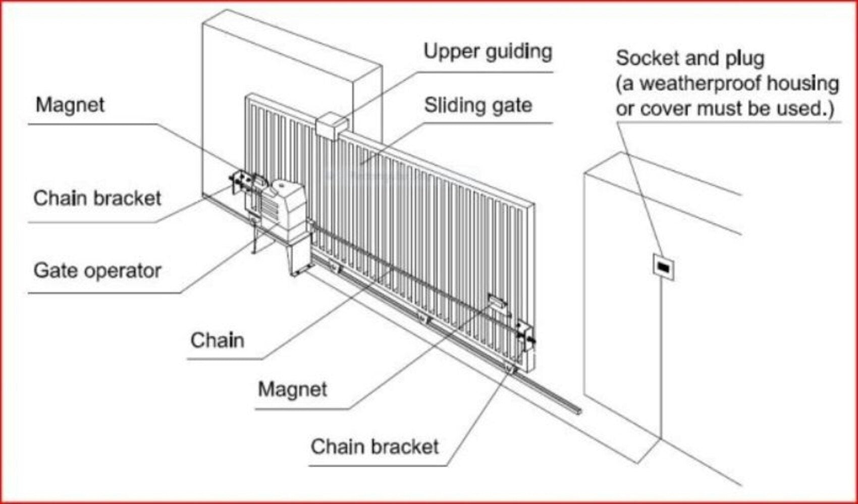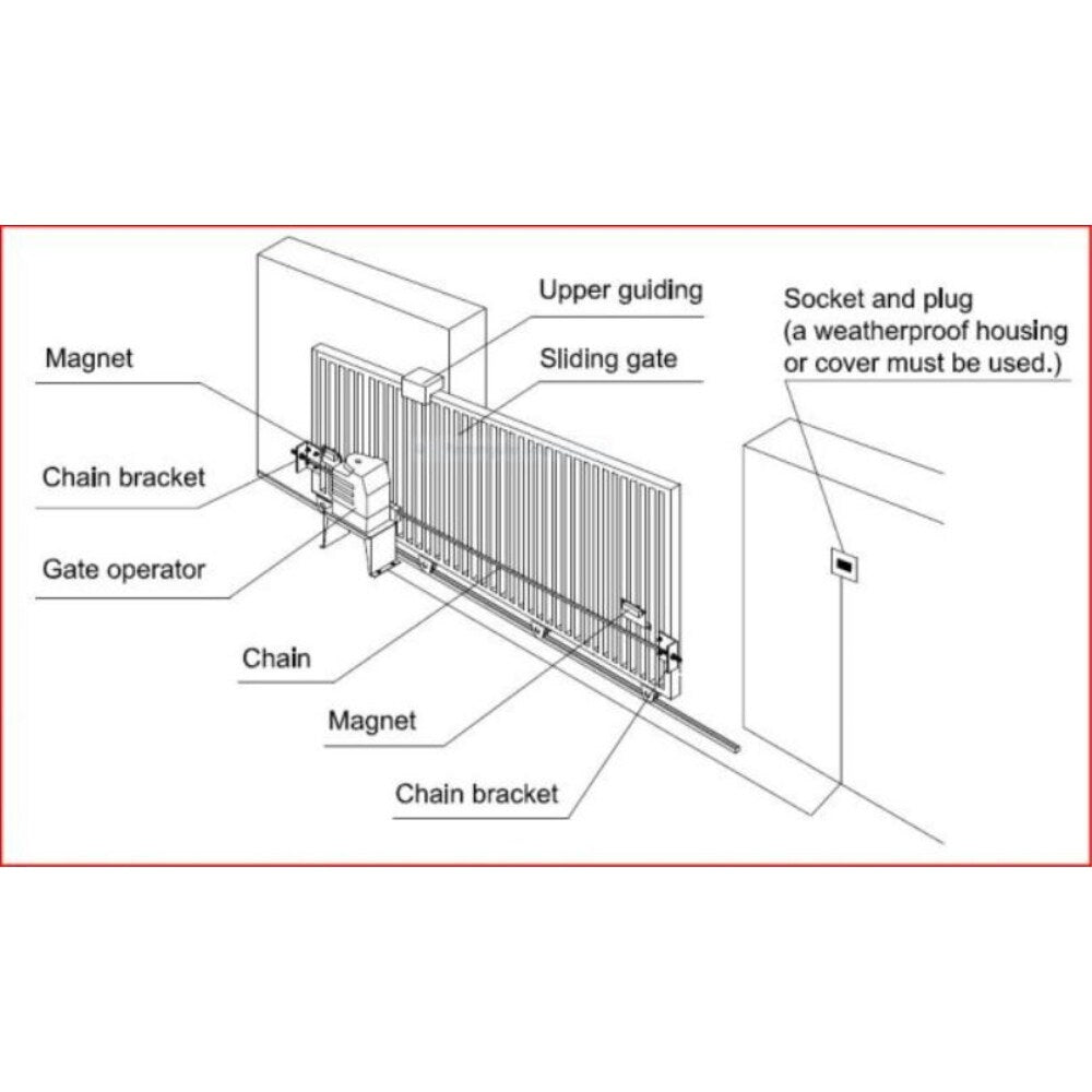1xSliding Gate Opener Unit, 1x20 Ft Chain, 1xMounting metal base, 2x433MHz remotes, 1xKeypad LM172-wireless, 1xKeypad metal cover, 1xPush button LM147-wired, 1 Set of Photocell LM102-wired, 1 Set of accessories + mounting hardware |
