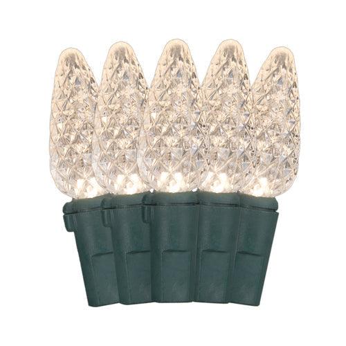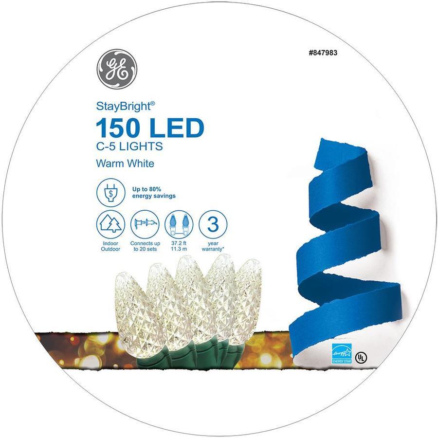 150-Count GE StayBright LED warm white C5 Christmas string lights Green cord with 37.2-ft lighted length matches your Christmas decor and illuminates your home's interior or exterior Can connect with up to 20 sets to make decorating your home a breeze Replacement bulbs and fuses included for added convenience ENERGY STAR qualified products help you save money on utility bills without sacrificing performance, style or comfort UL safety listing demonstrates this product has met minimum requirements of widely accepted product safety standards 3-Year limited warranty gives you peace of mind Perfect for Christmas trees, ceilings and roof lines