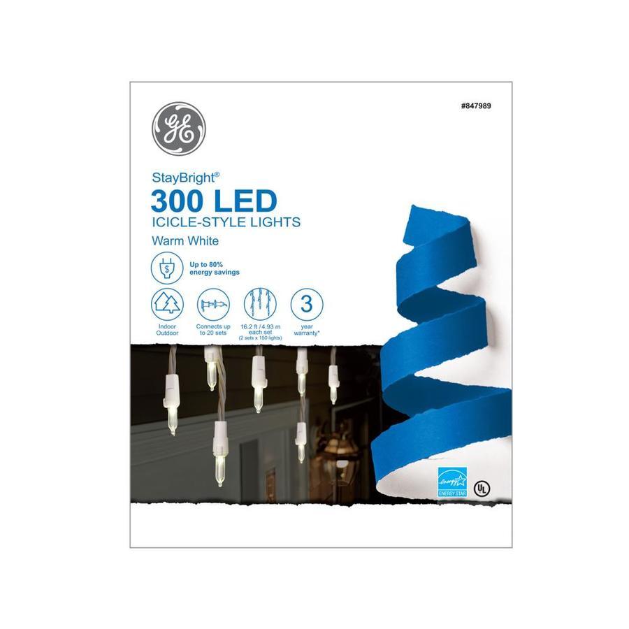 300-Count GE StayBright LED warm white Christmas icicle lights White cord with 32.5-ft total lighted length matches your Christmas decor and illuminates your home's interior or exterior Can connect with up to 20 sets to make decorating your home a breeze Replacement bulbs and fuses included, so you're prepared if a light goes out ENERGY STAR qualified products help you save money on utility bills without sacrificing performance, style or comfort UL safety listing demonstrates this product has met minimum requirements of widely accepted product safety standards 3-Year limited warranty gives you peace of mind Available only at ARB265W