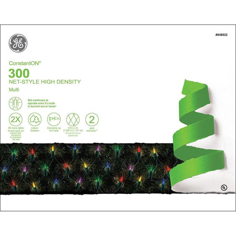 GE ConstantON multicolor high density Christmas net lights ConstantON lights continue to operate even when a bulb is burned out or loose Green cord with 24-sq ft lighted length blends in with your holiday decor while illuminating your indoor or outdoor space Can connect up to 3 sets Replacement bulbs and fuses included for added convenience 2-Year limited warranty gives you peace of mind Available only at ARB265W