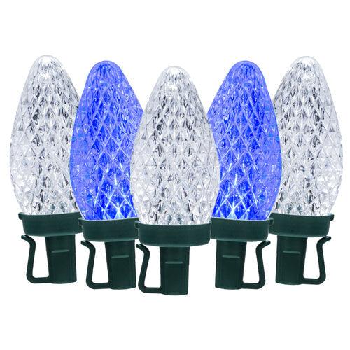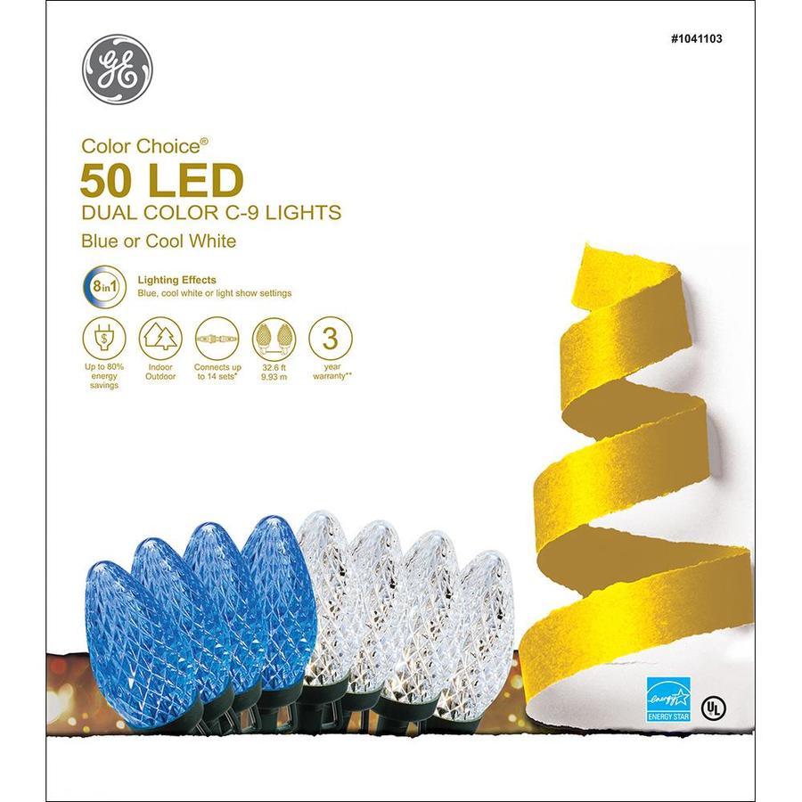 50-Count GE LED color choice C9 diamond cut reflector lights Use control box to choose blue, cool white or light show With LED lights you get up to 80% energy savings Connects up to 14 sets 32.6-Feet lighted length Green cord set with fused plug and 12-In lead wire Replacement bulbs and fuses included for added convenience Available only at ARB265W