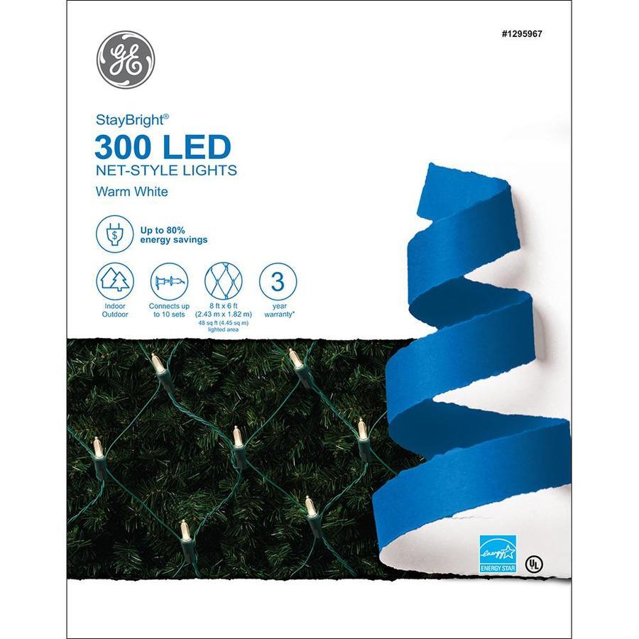 300-Light GE StayBright LED warm white 5.5-mm net light set 48 Square feet lighted area with end connector plug Can connect up to 10 sets ENERGY STAR certified Replacement bulbs and fuses included for added convenience Available only at ARB265W