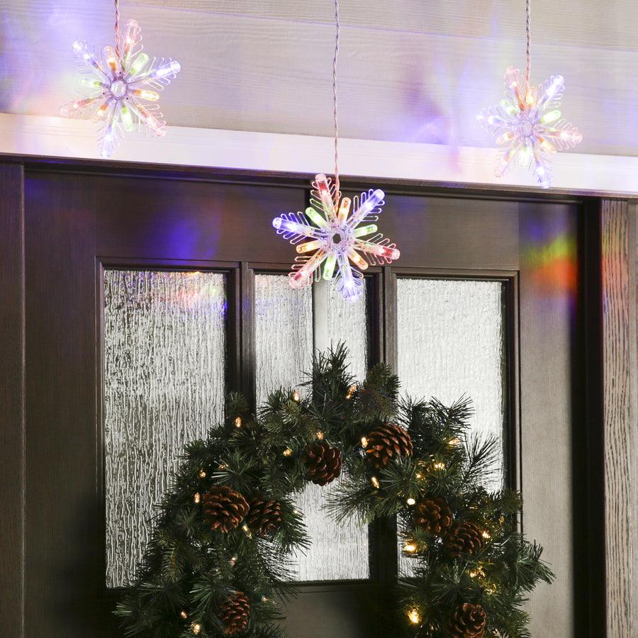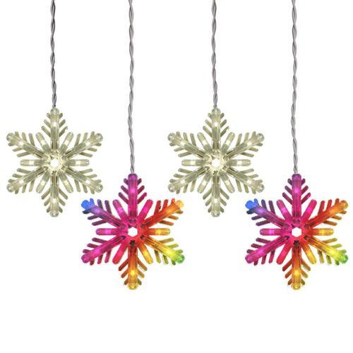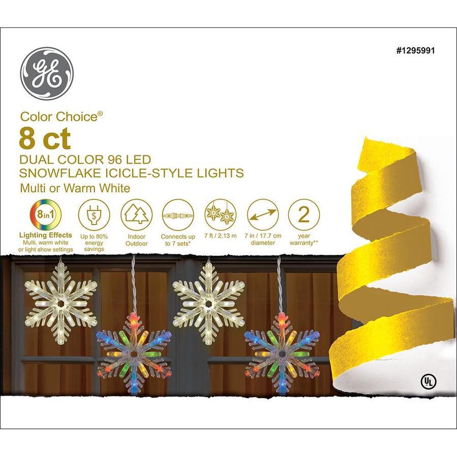 GE LED Color Choice 8-count snowflake icicle light set Use control box to choose between warm white, multicolor or light show With LED lights you get up to 80% energy savings Can connect up to 7 sets Replacement bulbs and fuses included for added convenience Available only at ARB265W