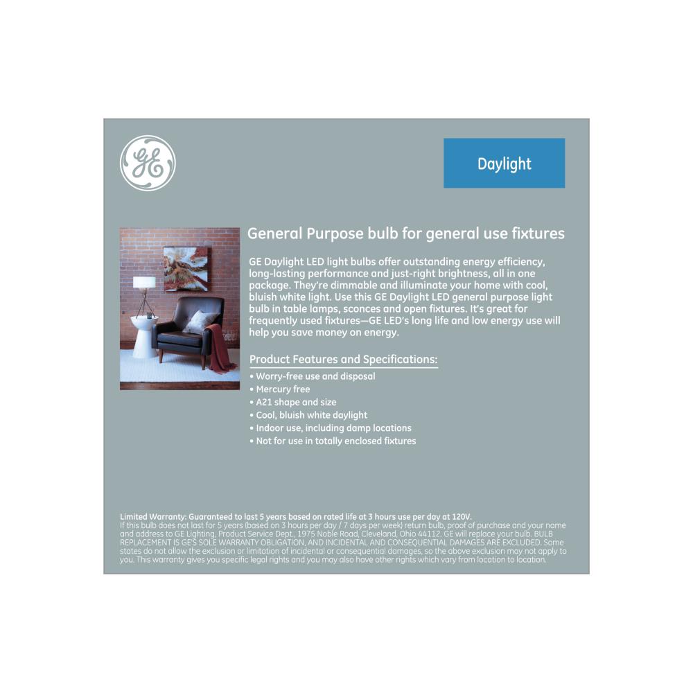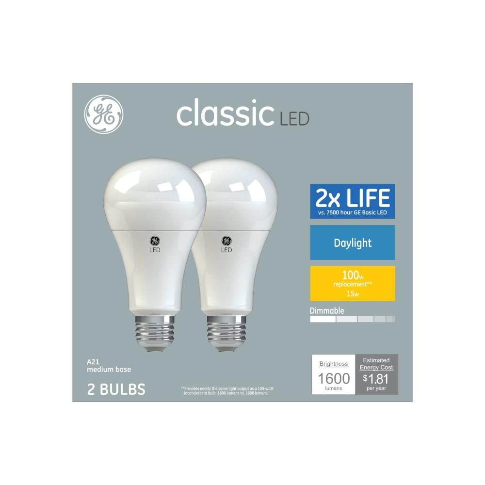 Upgrade to bright, cool daylight with GE Classic A21 LED bulbs delivering 1600 lumens while using only 15W. These dimmable, medium-base LEDs are ideal for general-purpose indoor fixtures and are rated for long life to cut energy and replacement costs.