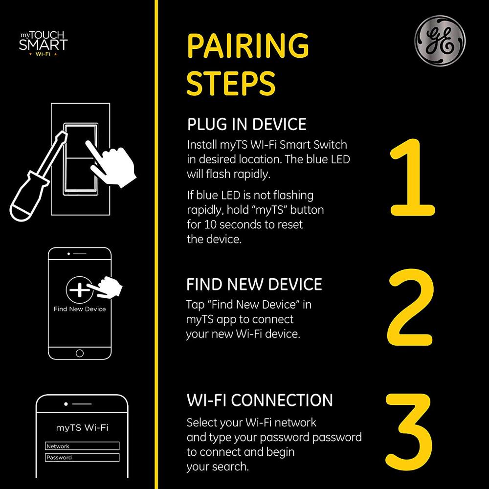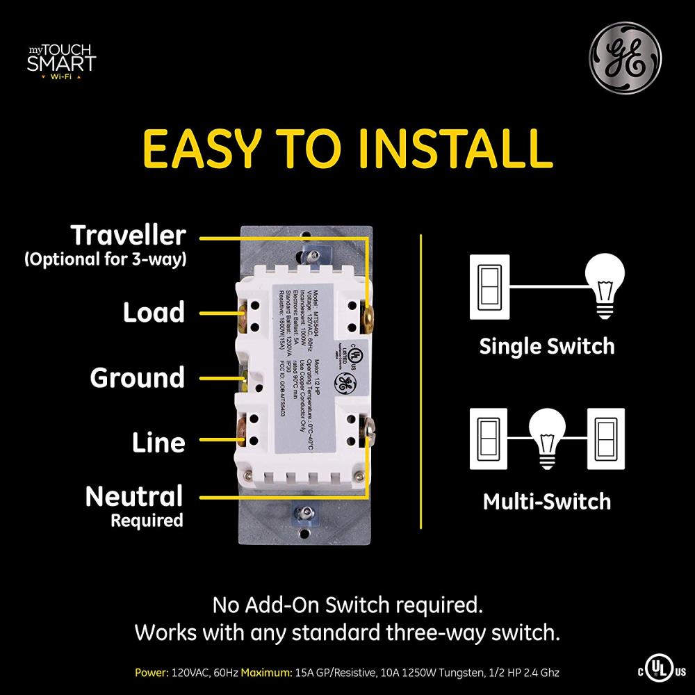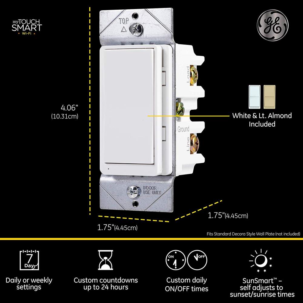 Upgrade any room with GE’s myTouchSmart in‑wall Wi‑Fi light switch. It delivers 3‑way control, app scheduling, and voice integration with Alexa and Google Assistant, all without a hub. Includes interchangeable white and light almond paddles; neutral wire required.