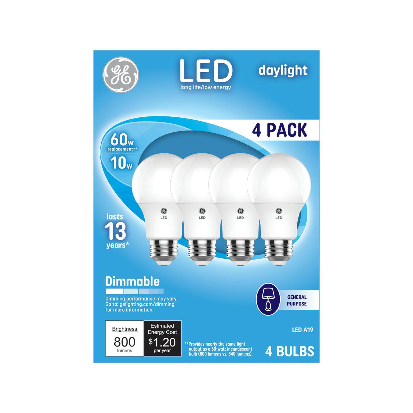 GE Classic A19 LED bulbs deliver cool daylight (5000K) brightness while using only 10W to replace 60W incandescents. Dimmable and long-lasting, they provide 800 lumens of general-purpose light with an estimated $1.20 yearly energy cost.