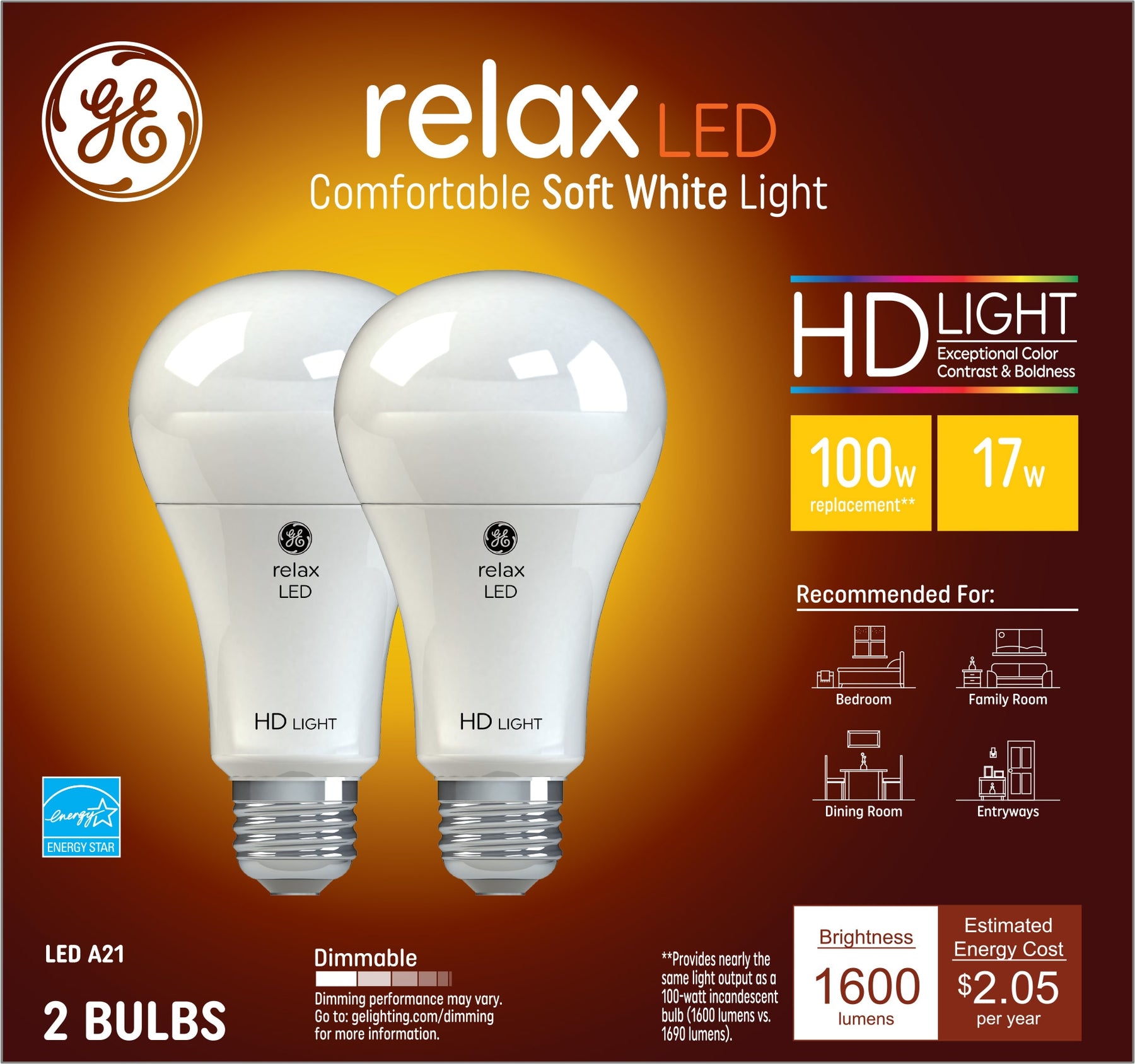 Upgrade everyday lighting with GE Relax HD A21 LED bulbs delivering warm, soft white 2700K light and 1600 lumens while using only 17 watts. These dimmable, Energy Star-marked bulbs fit standard E26 sockets and are rated for 15,000 hours to cut energy and replacement costs.