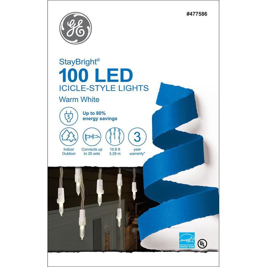 100-Count GE StayBright LED warm white Christmas icicle lights White cord with 10.8-ft lighted length matches your Christmas decor and illuminates your home's interior or exterior Can connect with up to 25 sets to make decorating your home a breeze Replacement bulbs and fuses included for added convenience ENERGY STAR qualified products help you save money on utility bills without sacrificing performance, style or comfort UL safety listing demonstrates this product has met minimum requirements of widely accepted product safety standards 3-Year limited warranty gives you peace of mind
