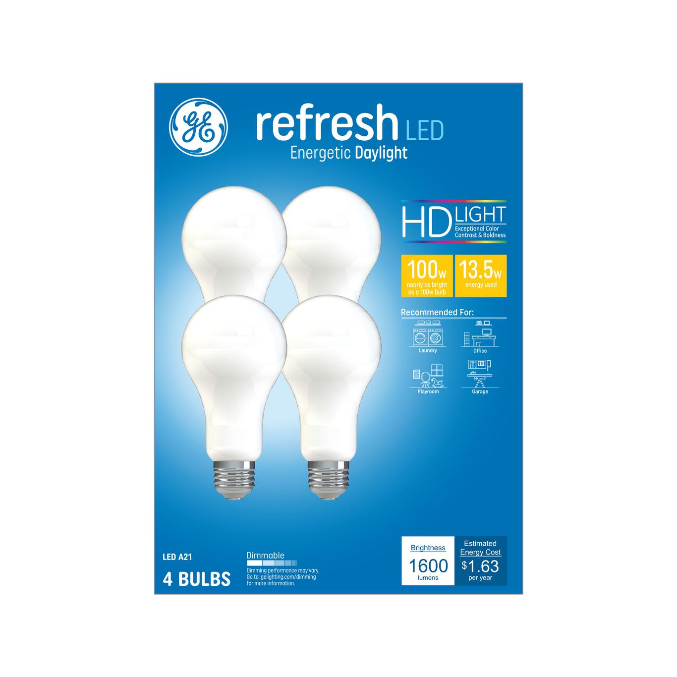 GE Refresh HD LED A21 Light Bulbs, 100W Replacement, 1600 Lumens, Daylight, Dimmable (4-Pack)