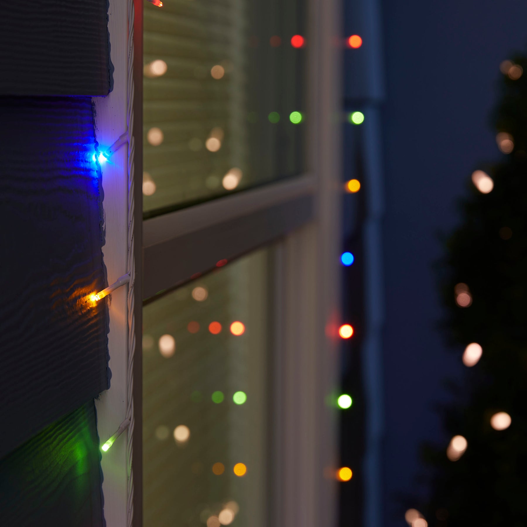 These GE Color Choice MicroBright LED string lights deliver 150 color-changing bulbs on a 43.4-foot white cord with a control box for multiple effects. Ideal for indoor or outdoor displays, they offer warm white, multicolor, and light show settings and can link up to four sets.
