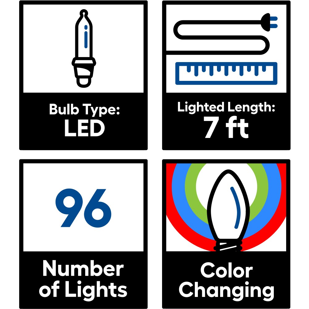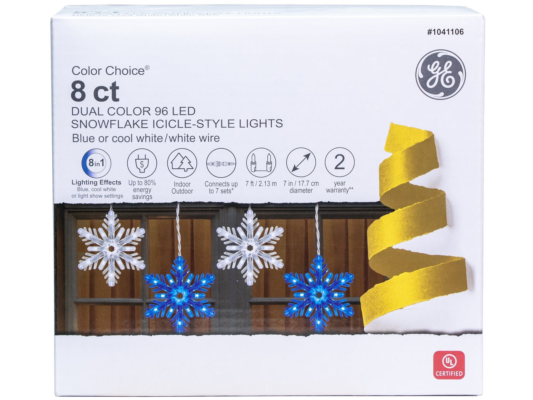 Bring a dazzling winter glow with GE Color Choice snowflake icicle lights. This 8-snowflake set features 96 color-changing LEDs and a control box to switch between blue, cool white, or light-show modes. Designed for indoor/outdoor use with a 7-ft lighted length and linkable up to 7 sets.