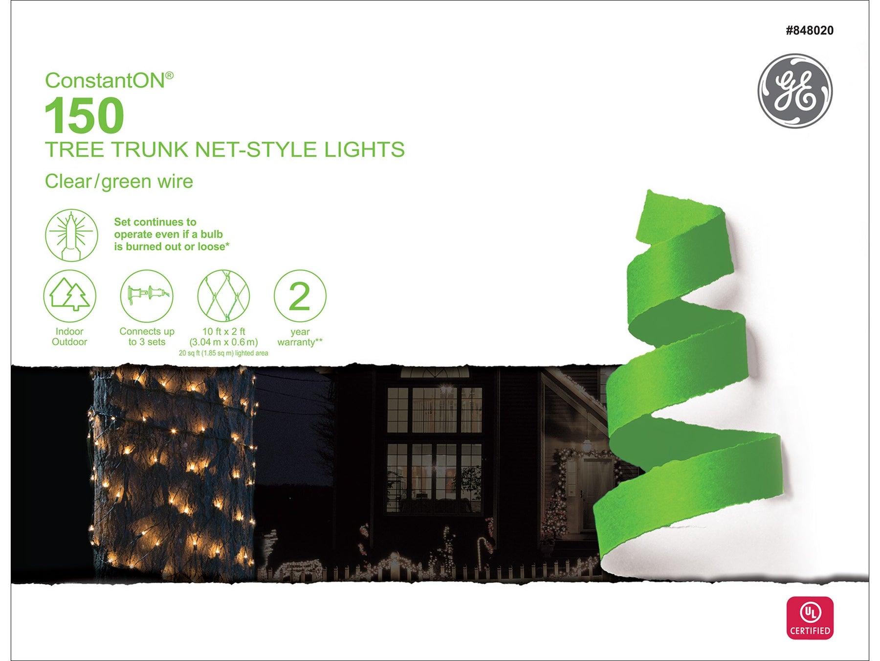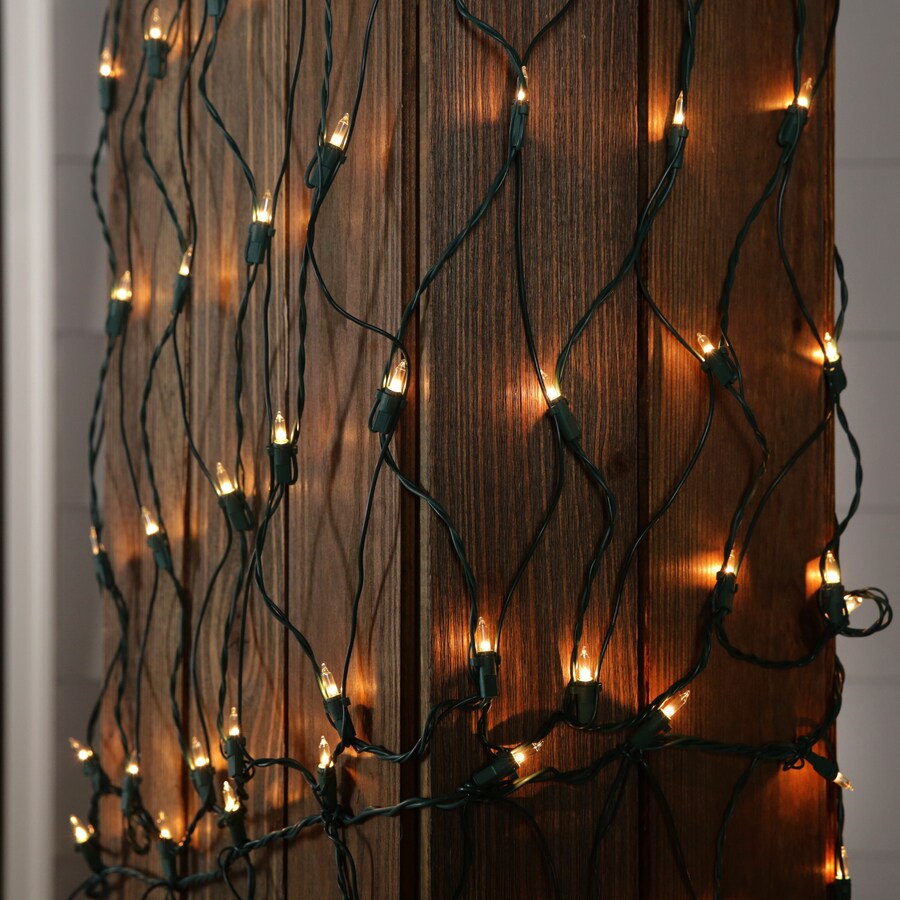 Cover trees and columns fast with GE ConstantON net lights. This 10-ft x 2-ft set features 150 clear incandescent mini bulbs on a green cord that stay lit even if a bulb is loose or burns out, ideal for indoor or outdoor holiday decorating.