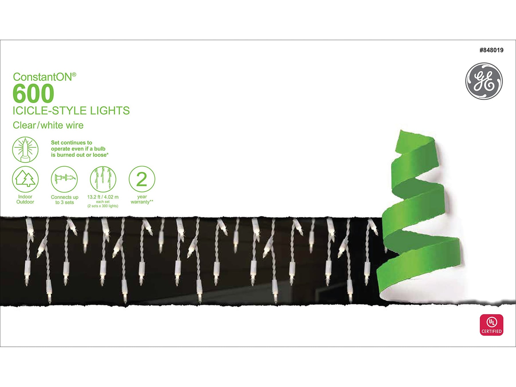 Brighten eaves and railings with GE ConstantON icicle lights featuring 600 clear mini incandescent bulbs on a white wire. The 26.4-ft lighted length connects up to three sets and stays lit even if a bulb is loose or burns out, making them ideal for indoor or outdoor holiday displays.
