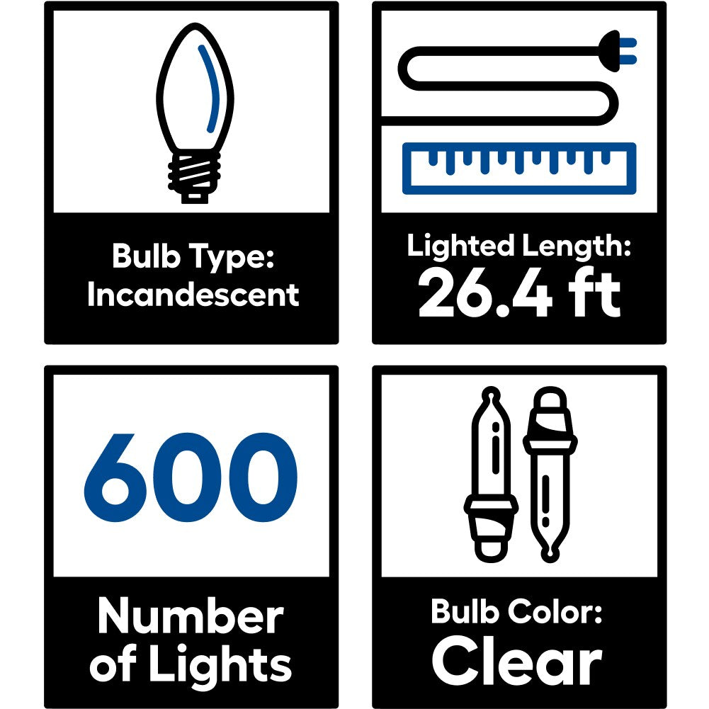 • Generous Coverage: 600 clear mini bulbs over 26.4-ft lighted length