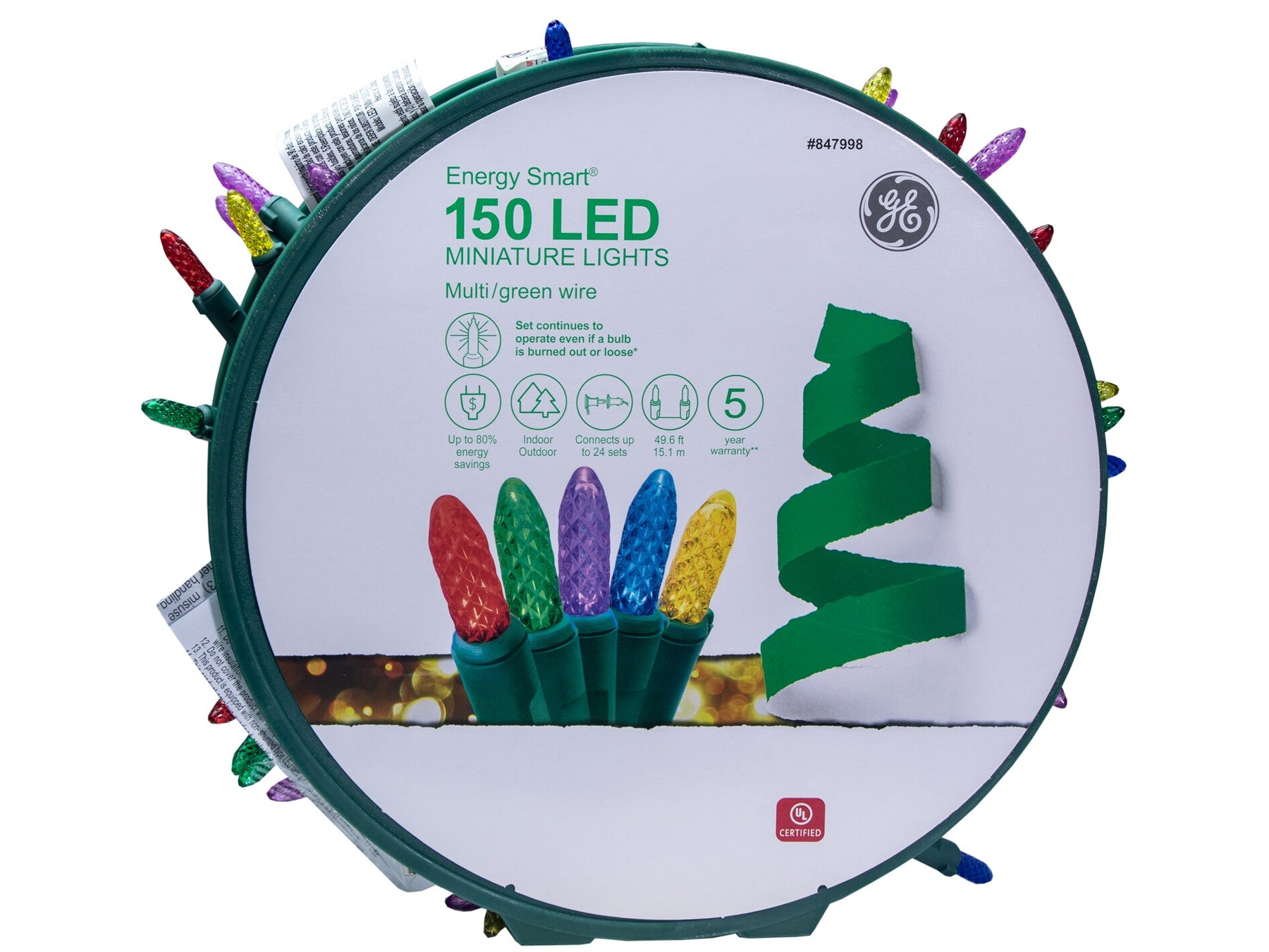 Brighten your holiday décor with GE Energy Smart LED string lights featuring 150 faceted mini bulbs on a 49.6-foot green wire. Designed for indoor/outdoor use, these durable LEDs stay lit even if a bulb is loose or burns out and can connect up to 24 sets for larger displays.