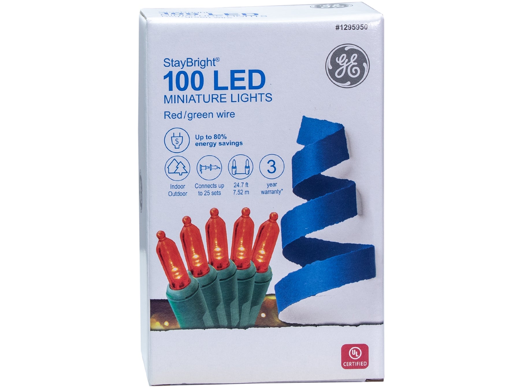 Brighten your holiday décor with GE StayBright mini LED string lights. This 24.7-ft strand features 100 red LEDs on a green cord with a fused plug, designed for indoor or outdoor use and linkable up to 25 sets.