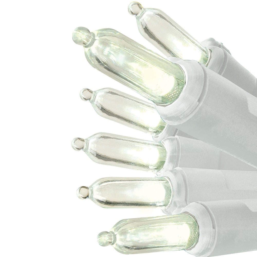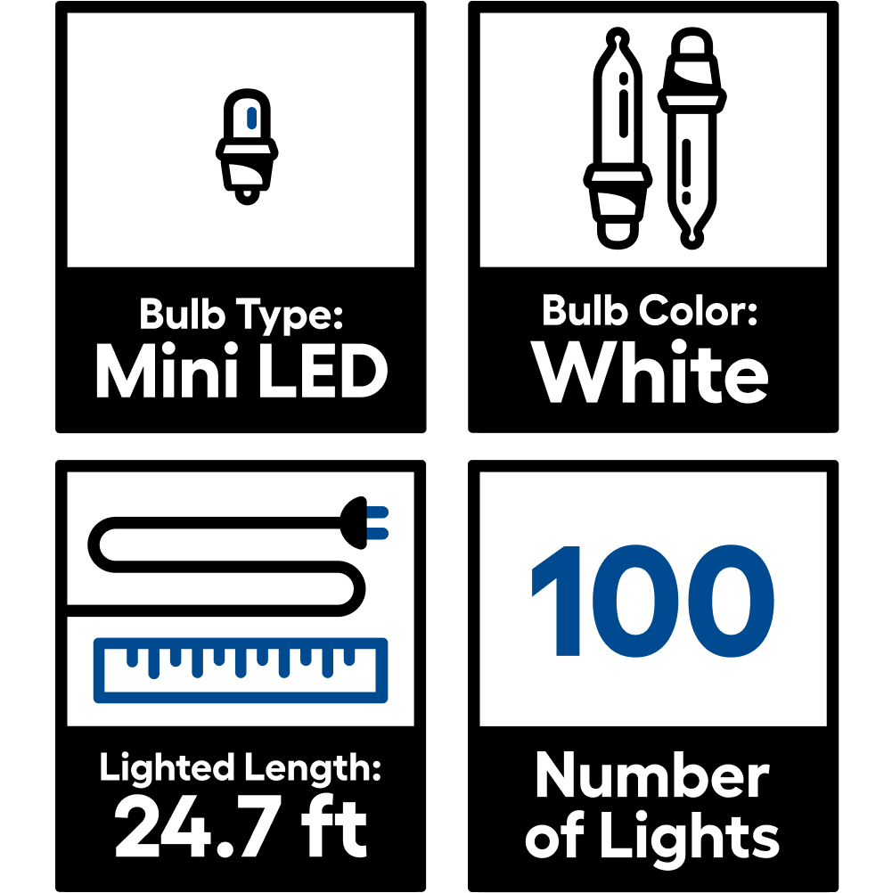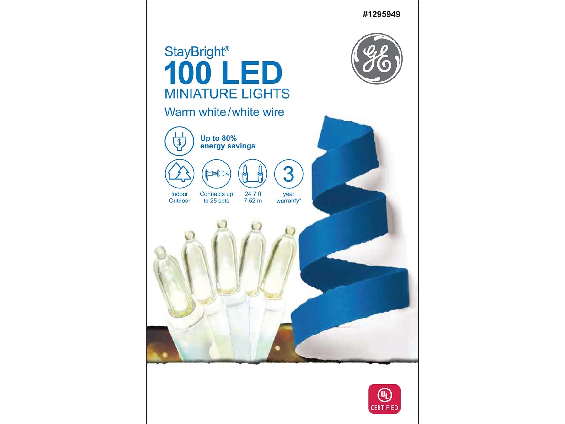 Brighten your holiday décor with GE StayBright 100-count warm white mini LED string lights on a white cord. With 24.7 ft of lighted length, these energy-saving LEDs connect up to 25 sets and are rated for indoor/outdoor use.
