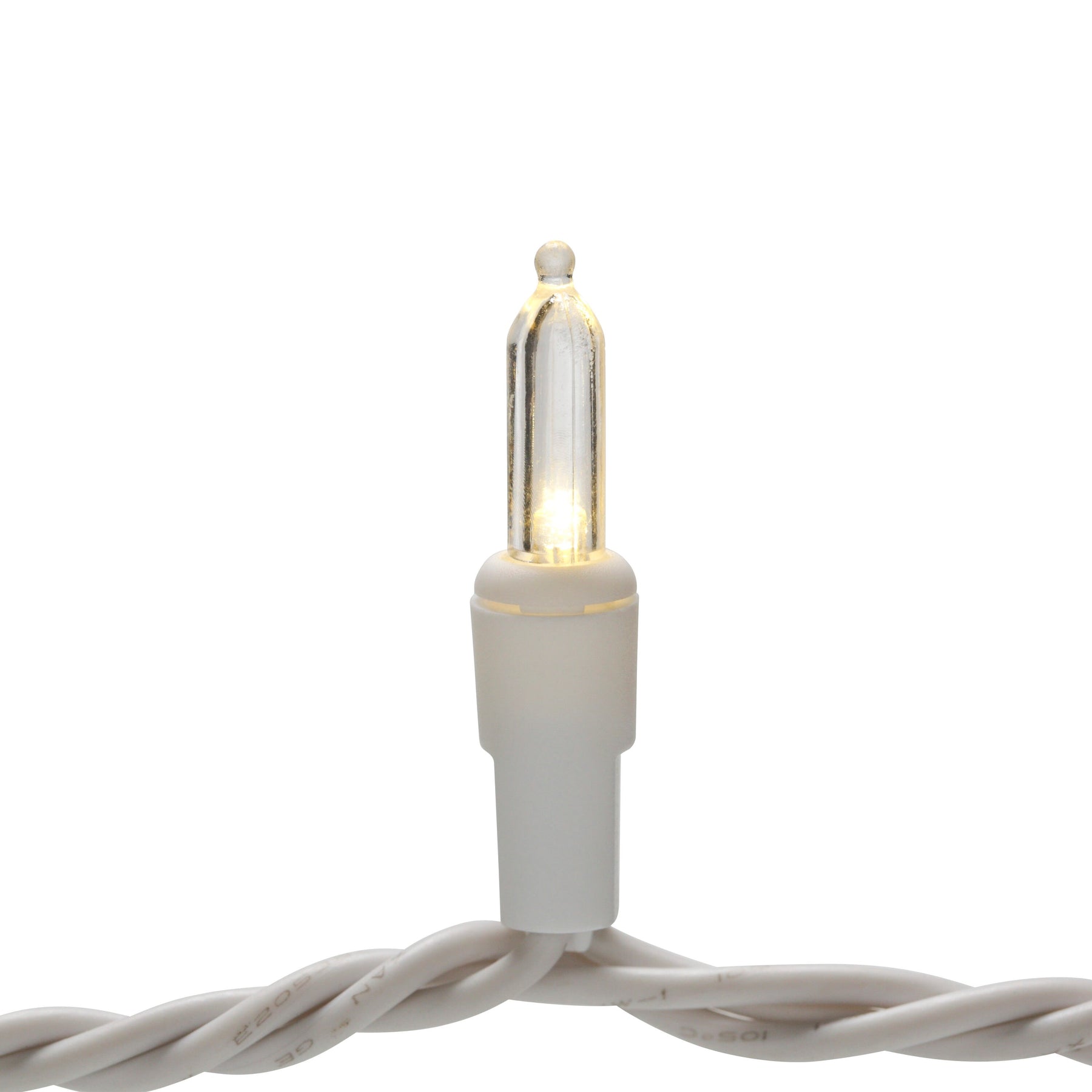 A: Warm white 5.5 mm mini LED bulbs with a transparent finish on a white cord.