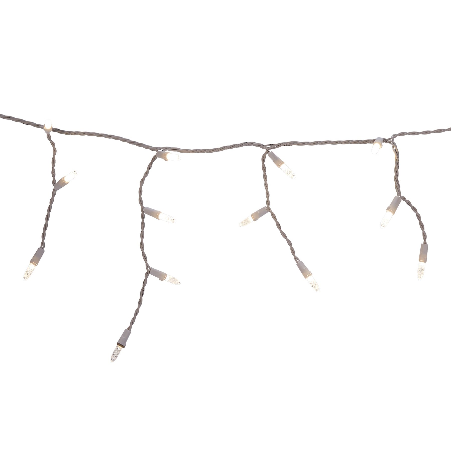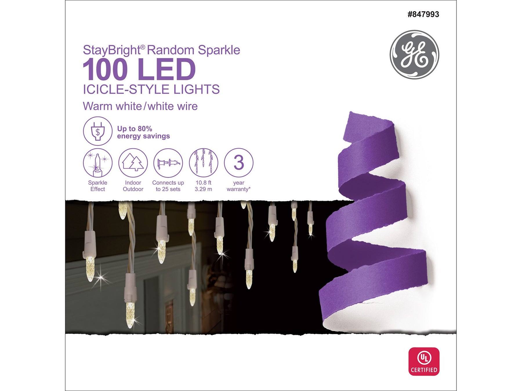Illuminate eaves and railings with GE StayBright Random Sparkle icicle lights featuring 100 warm white 7mm LEDs on a white wire. With a 10.8-ft lighted length, fused plug, and end-to-end connectivity up to 25 sets, they’re built for festive indoor or outdoor displays.