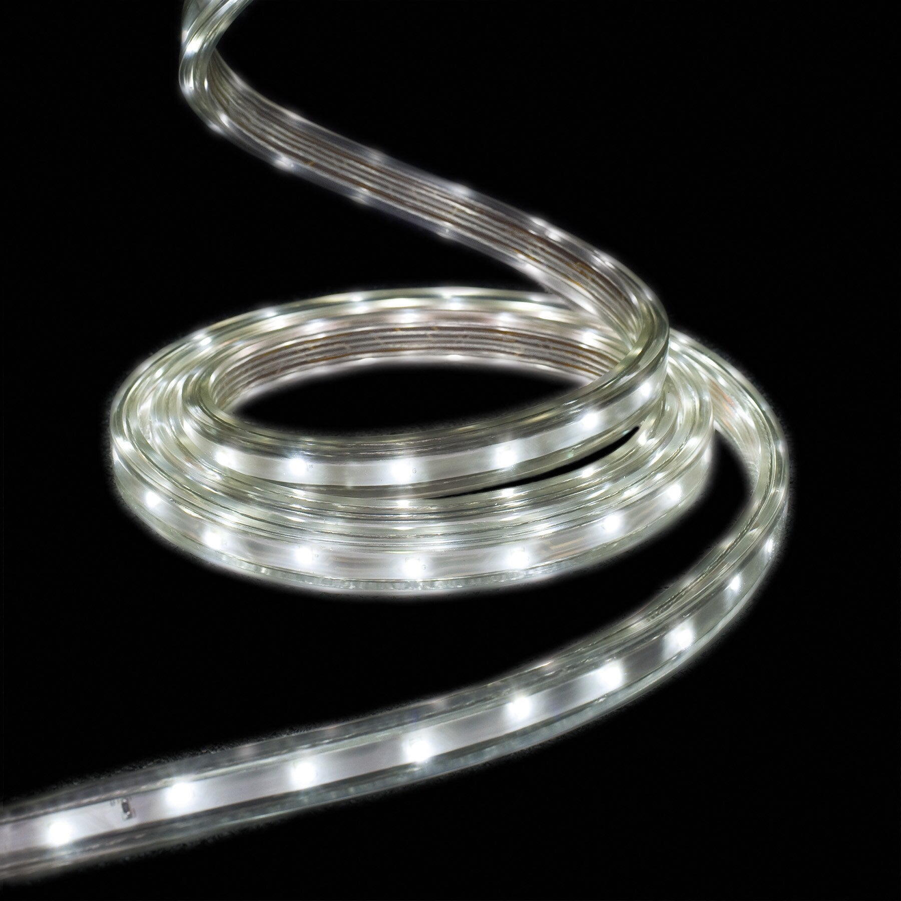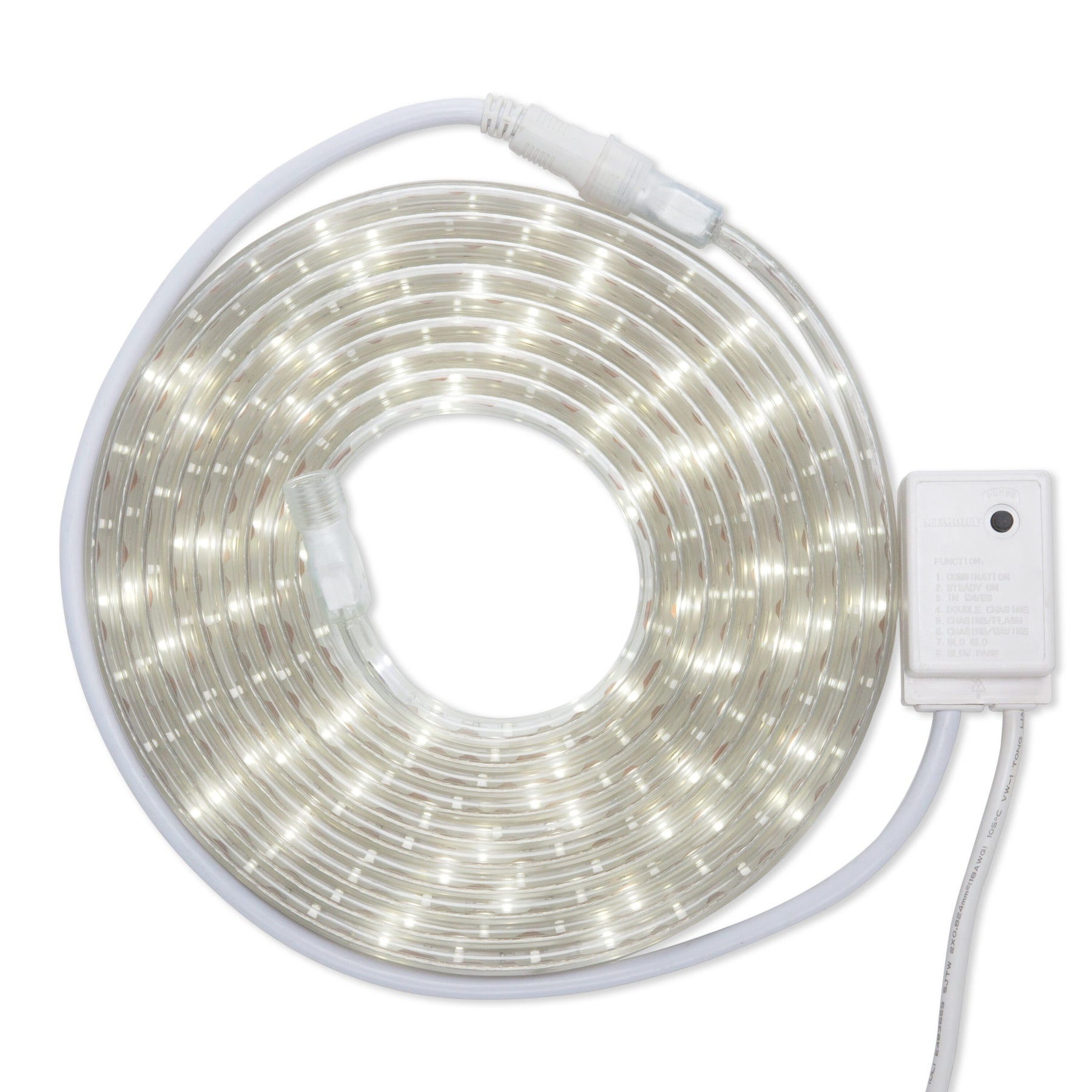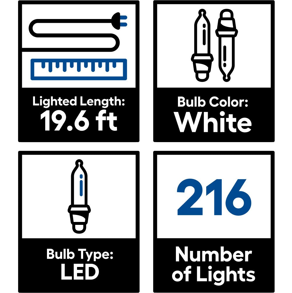 Bright white GE StayBright LED tape lights deliver 216 integrated LEDs across 19.6 ft for festive, energy-efficient illumination. Multi-function control offers 8 lighting effects, and the clear tubing blends indoors or outdoors. Link up to 8 sets for larger displays.