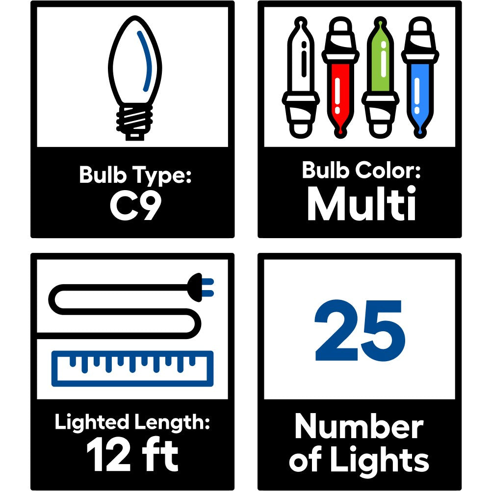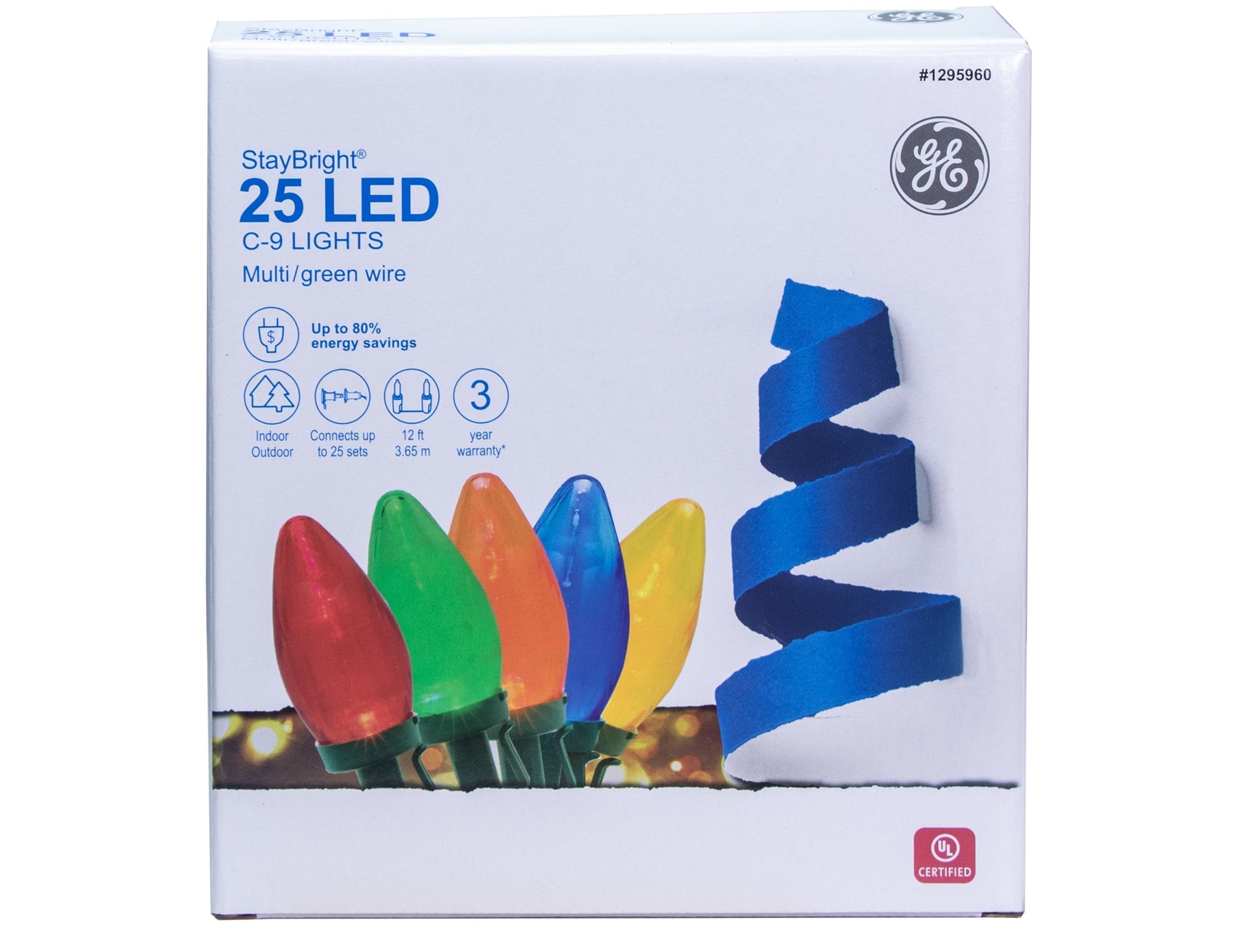 Brighten your holidays with GE StayBright C9 LED string lights featuring 25 multicolor transparent bulbs on a 12-ft green cord. Designed for indoor or outdoor use, these energy-saving LEDs link up to 25 sets for easy decorating across larger spaces.