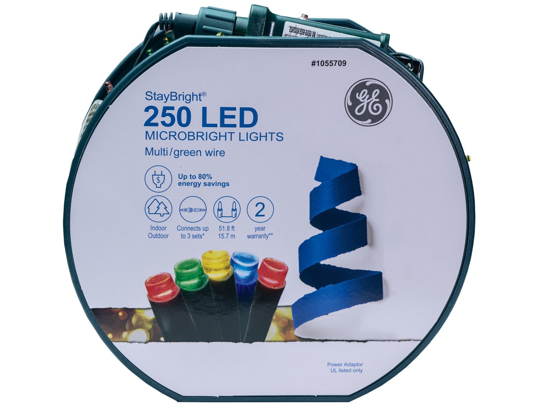 Brighten holiday displays with GE StayBright MicroBright LED string lights. This 250-count multicolor set features a 51.8-ft lighted length on a green cord, suitable for indoor or outdoor use, and can link up to three sets.