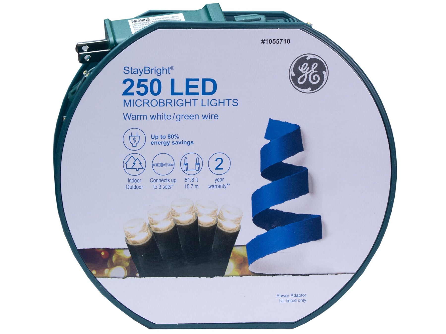 Brighten your holiday décor with GE StayBright MicroBright LED string lights. This 250-count warm white set delivers a 51.8‑ft lighted length on a green cord, designed for indoor/outdoor use and linkable up to 3 sets for larger displays.