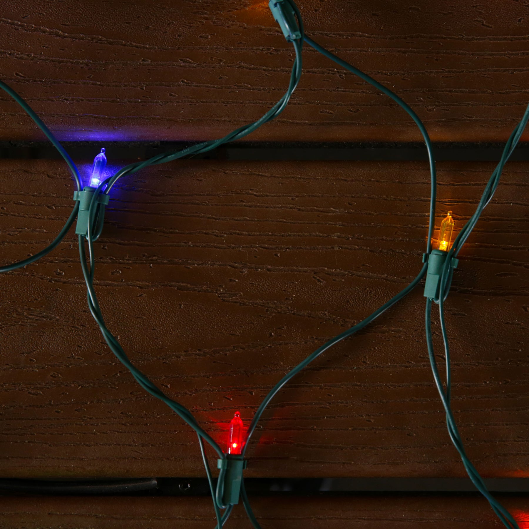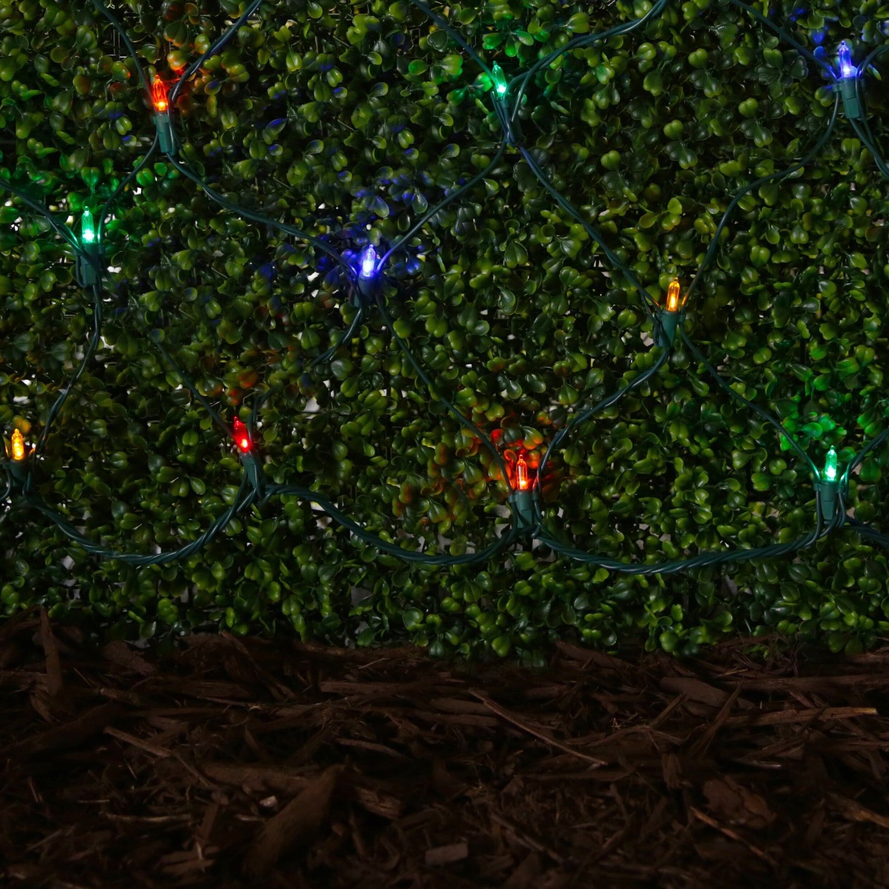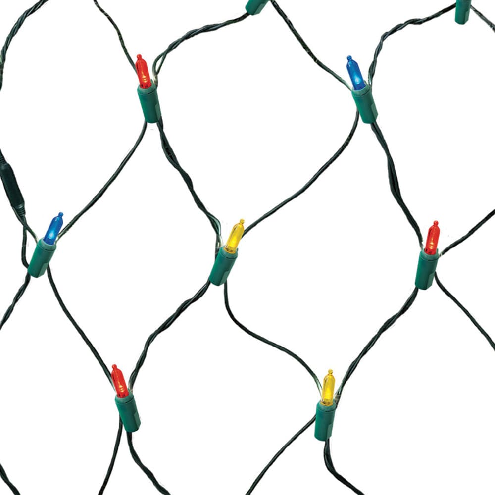 Dress shrubs and railings in festive color with GE StayBright LED net lights. This 5 ft x 4 ft net covers 20 sq ft with 100 multicolor mini LEDs on a green wire and a constant-on pattern, ideal for indoor or outdoor use.