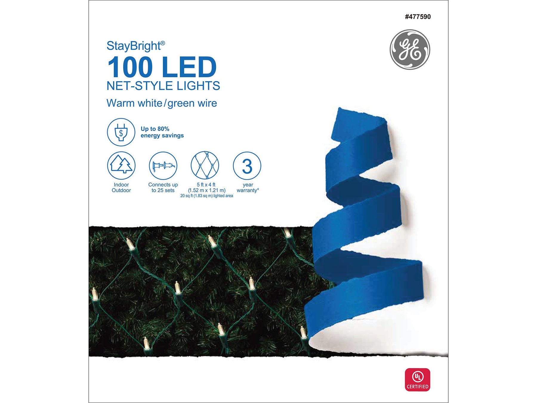 Illuminate shrubs and hedges with GE StayBright LED net lights featuring a 5 ft x 4 ft coverage area. The warm white, constant-on mini LEDs on a green wire are UL certified for indoor/outdoor use and link up to 25 sets for easy, efficient holiday decorating.