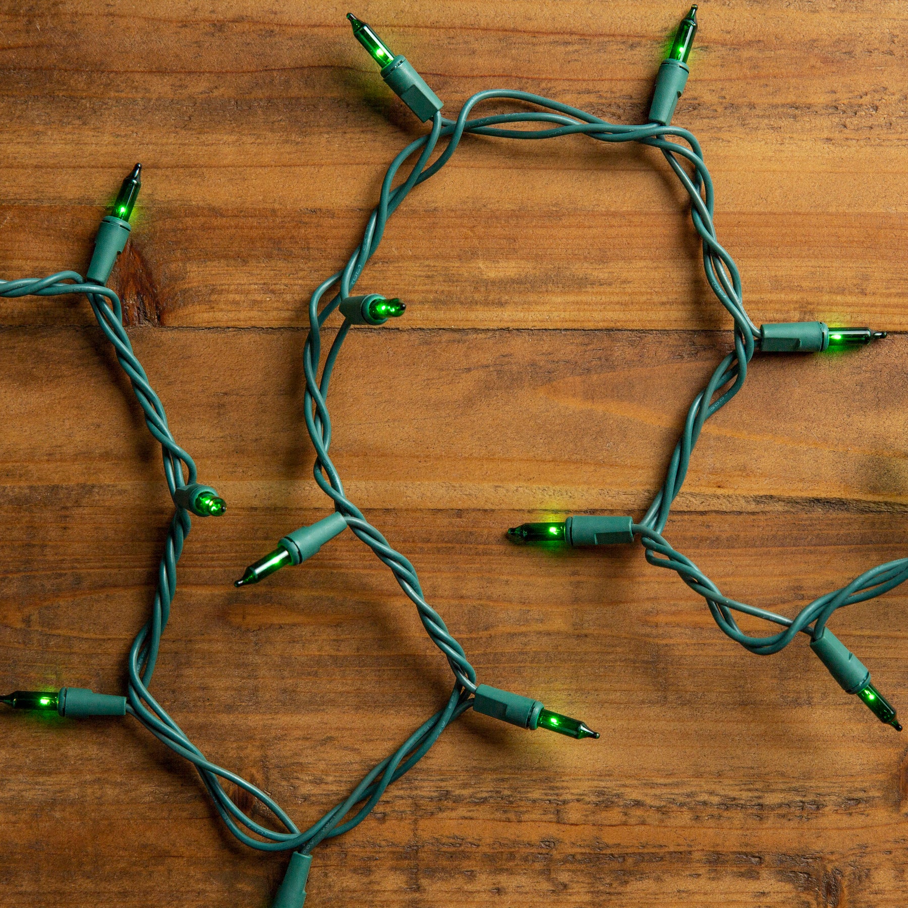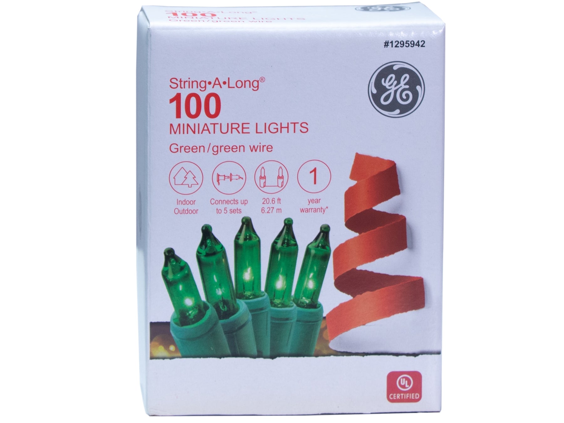 Bring classic holiday glow with GE String-A-Long 100-count green incandescent lights. The 20.6-ft lighted length on a green cord features mini bulbs and a fused plug for reliable indoor/outdoor use, and you can link up to five sets for larger displays.