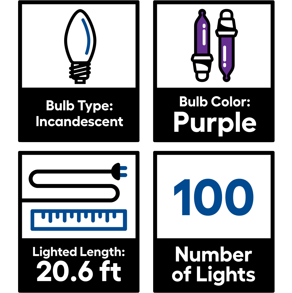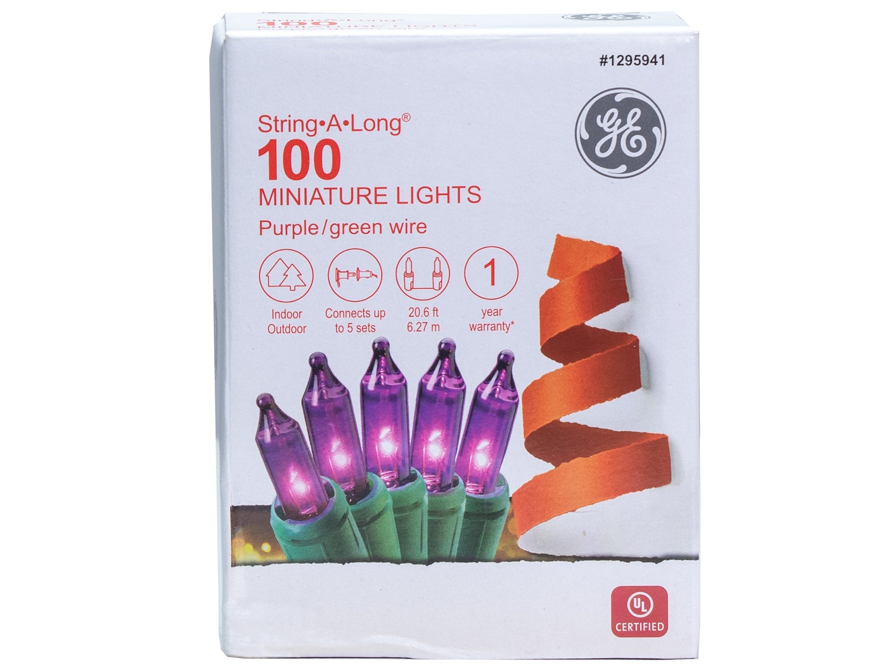 Brighten holiday décor with GE String-A-Long 100-count purple incandescent mini lights on a green cord. The 20.6-ft lighted length connects up to 5 sets and works indoors or outdoors with a fused plug.