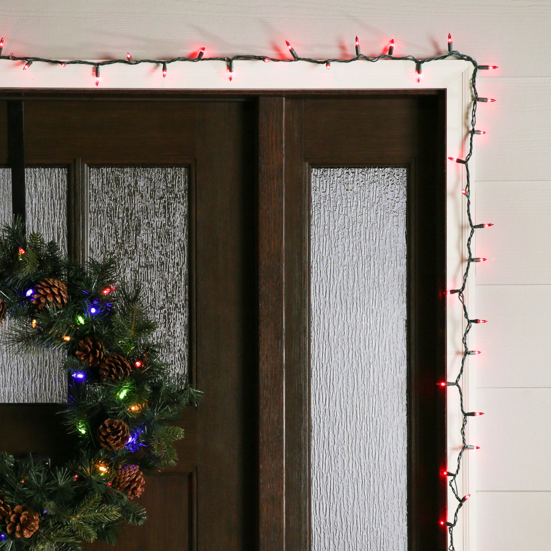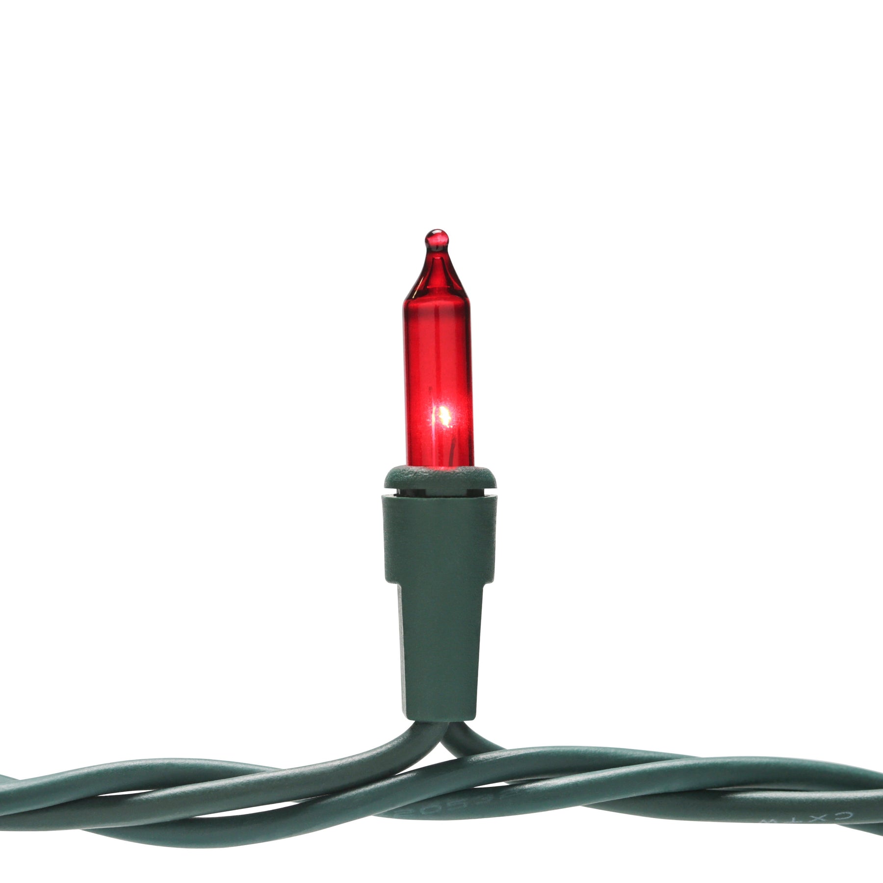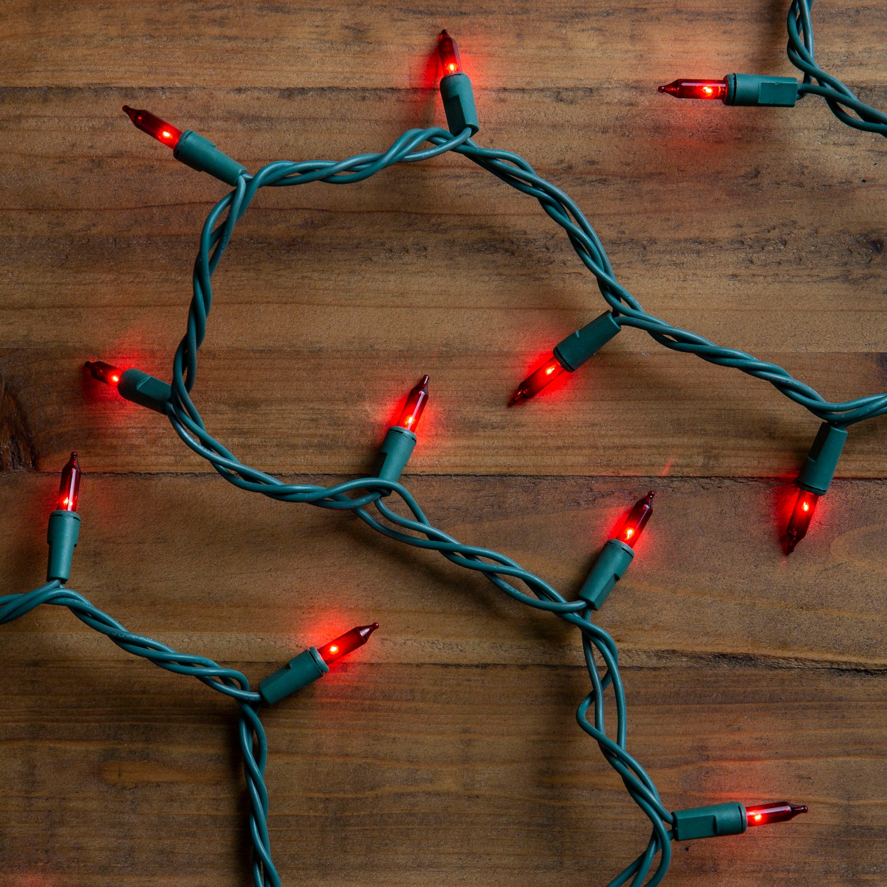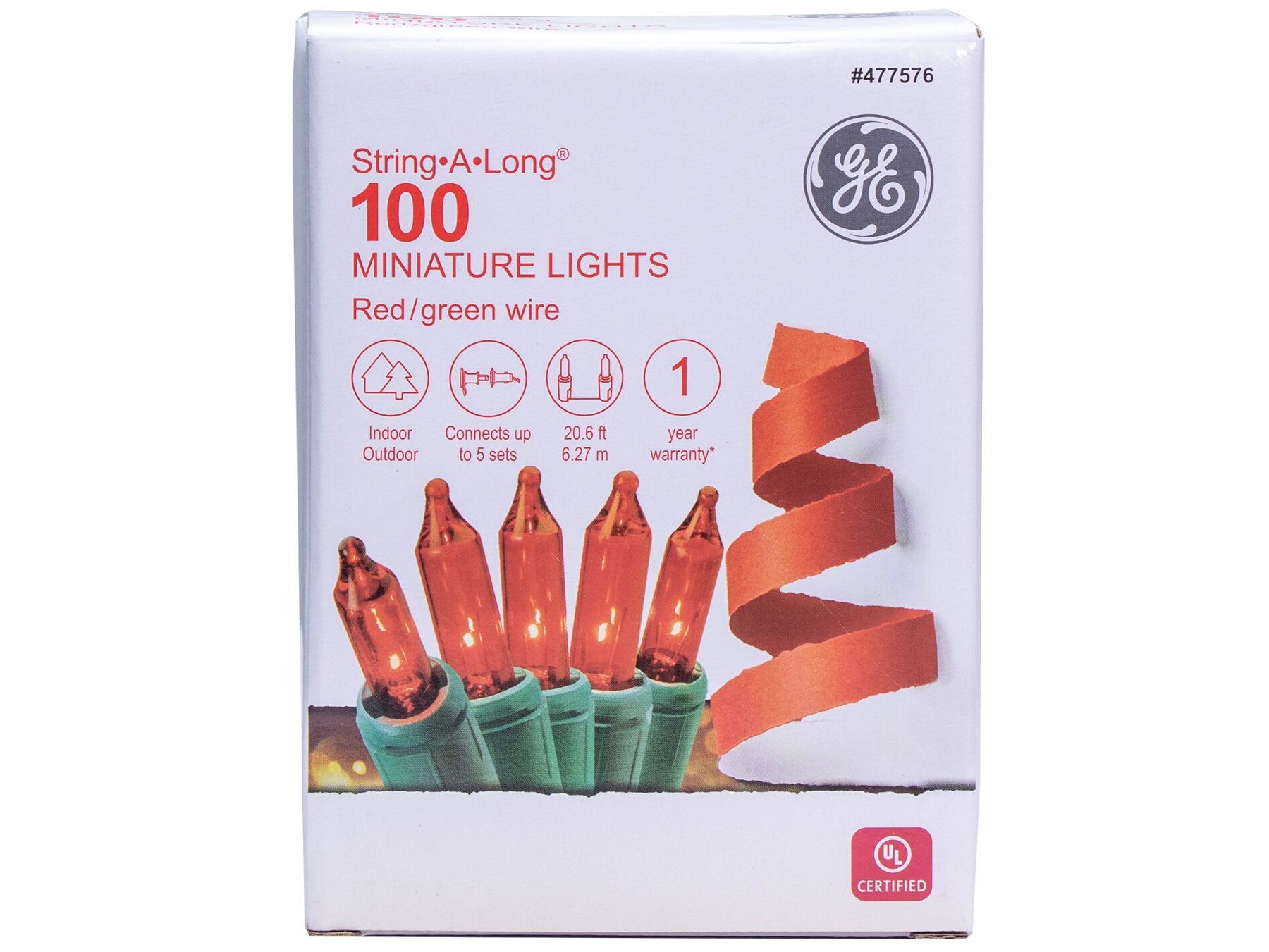 Brighten holiday décor with GE String-A-Long 100-count red incandescent mini lights on a green cord. The 20.6-ft lighted length features constant-on bulbs, a fused plug, and end-to-end connectors for up to 5 sets, suitable for indoor or outdoor use.