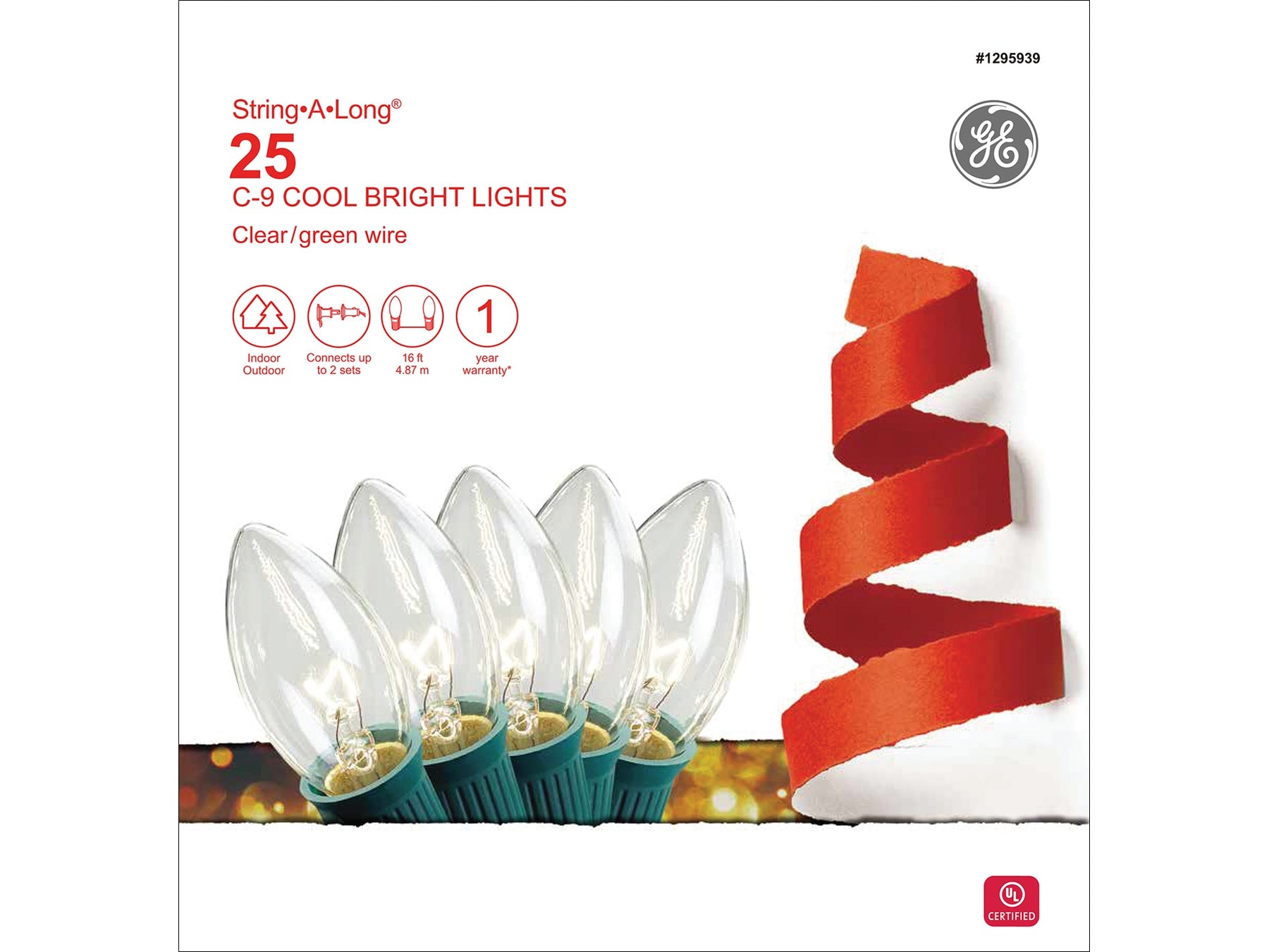 Classic GE String‑A‑Long C9 incandescent lights deliver bright, clear glow on a durable green wire for indoor or outdoor decorating. The 16‑ft lighted length with fused plug connects up to two sets and includes replacement fuse for easy maintenance.