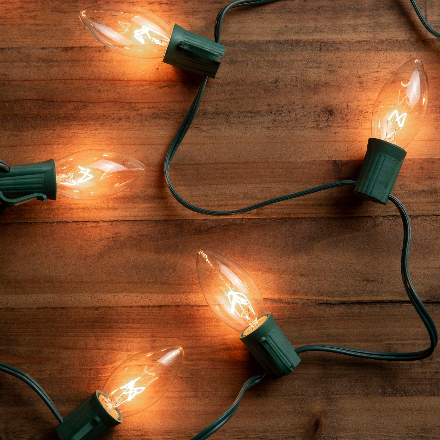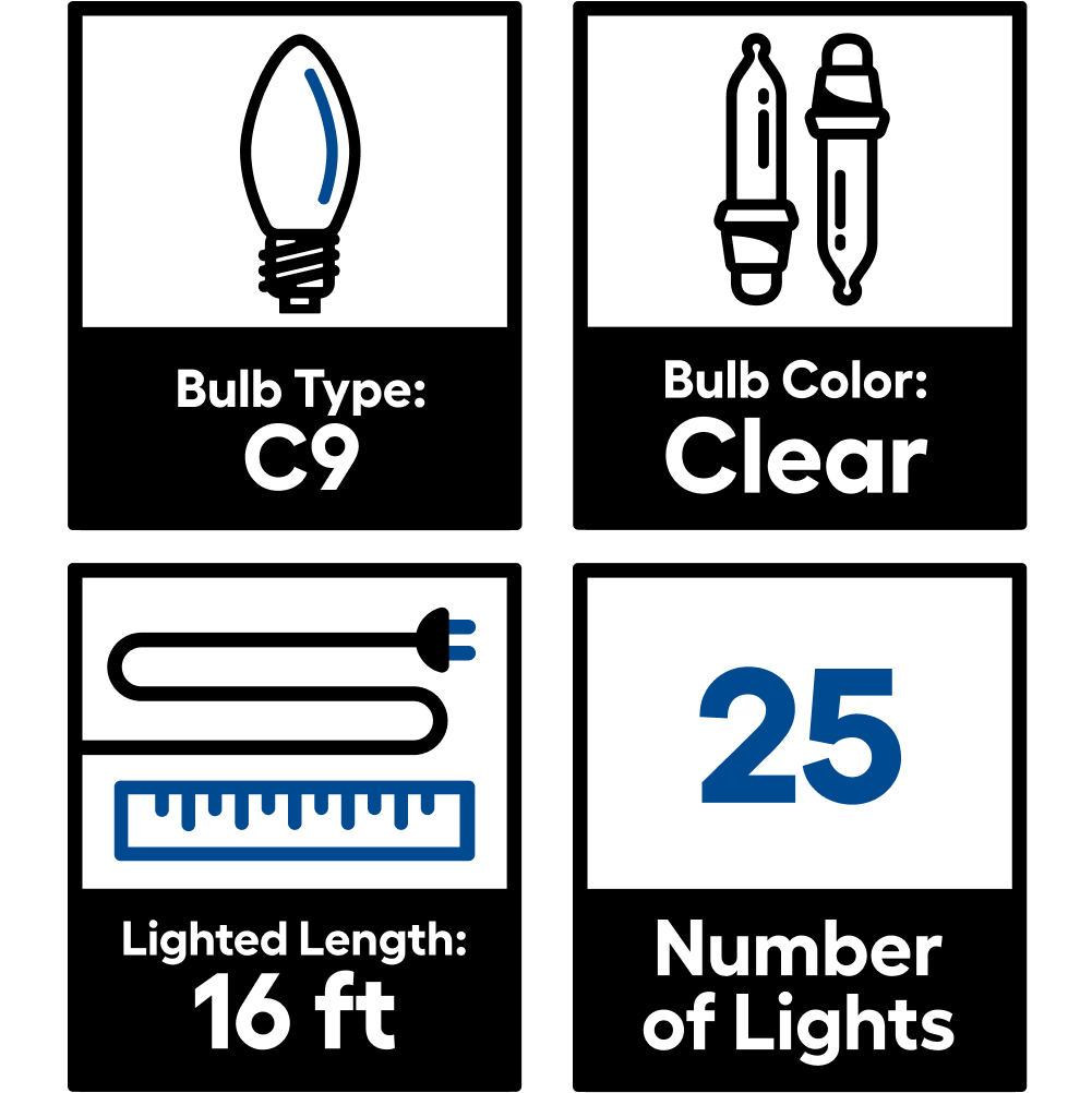 • Bright C9 Incandescent Bulbs: 25 clear, 7‑watt bulbs provide warm, classic holiday shine
